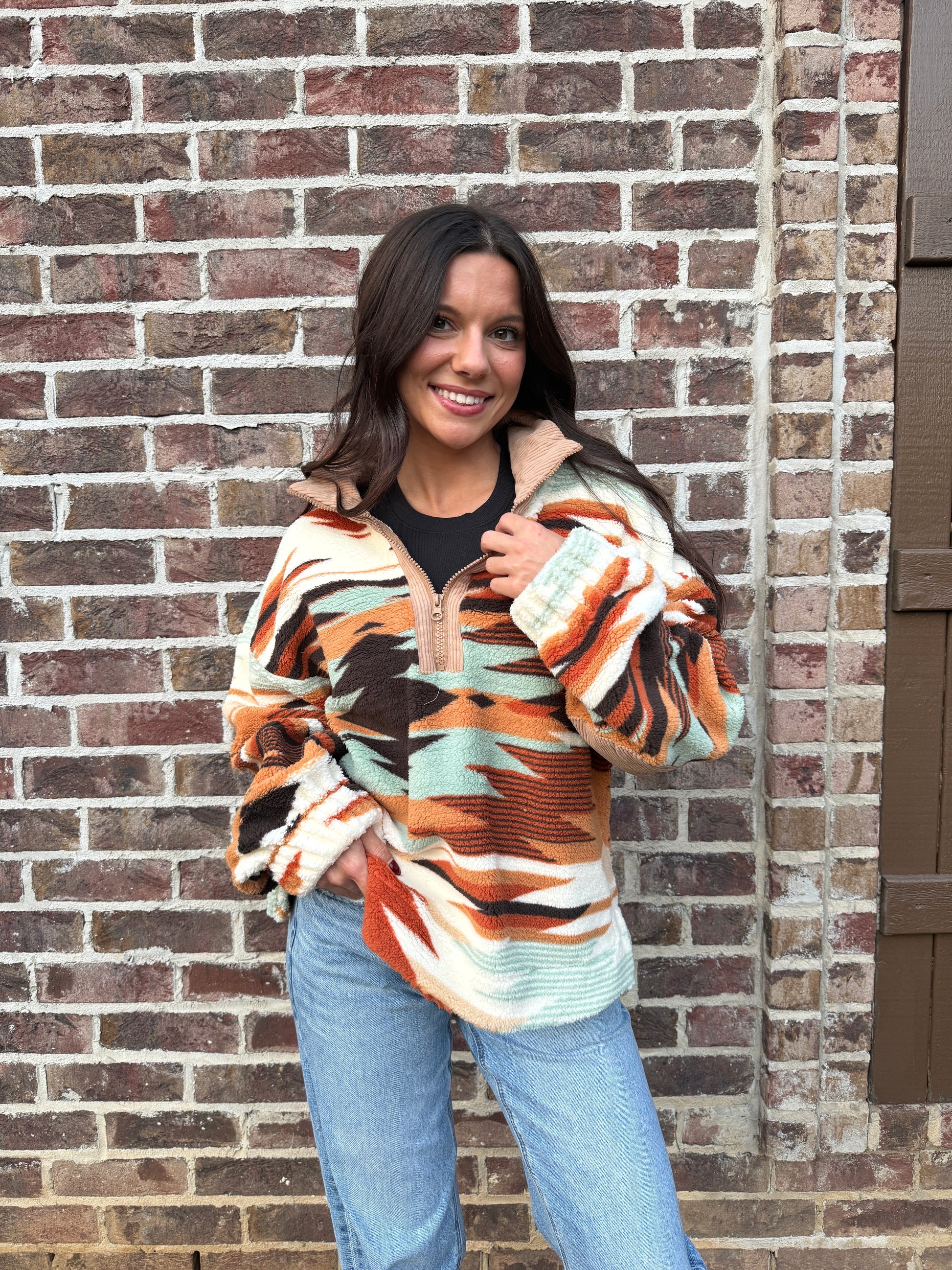 Layer up in style with this mint Aztec printed quarter zip sherpa! Cozy meets cool with its soft sherpa lining and eye-catching geometric patterns that bring serious personality to your everyday look. Perfect for those moments when you want comfort without sacrificing your vibe—throw it on over your favorite tee and you're ready to go. Whether you're heading out or hanging low, this piece keeps you warm while turning heads.