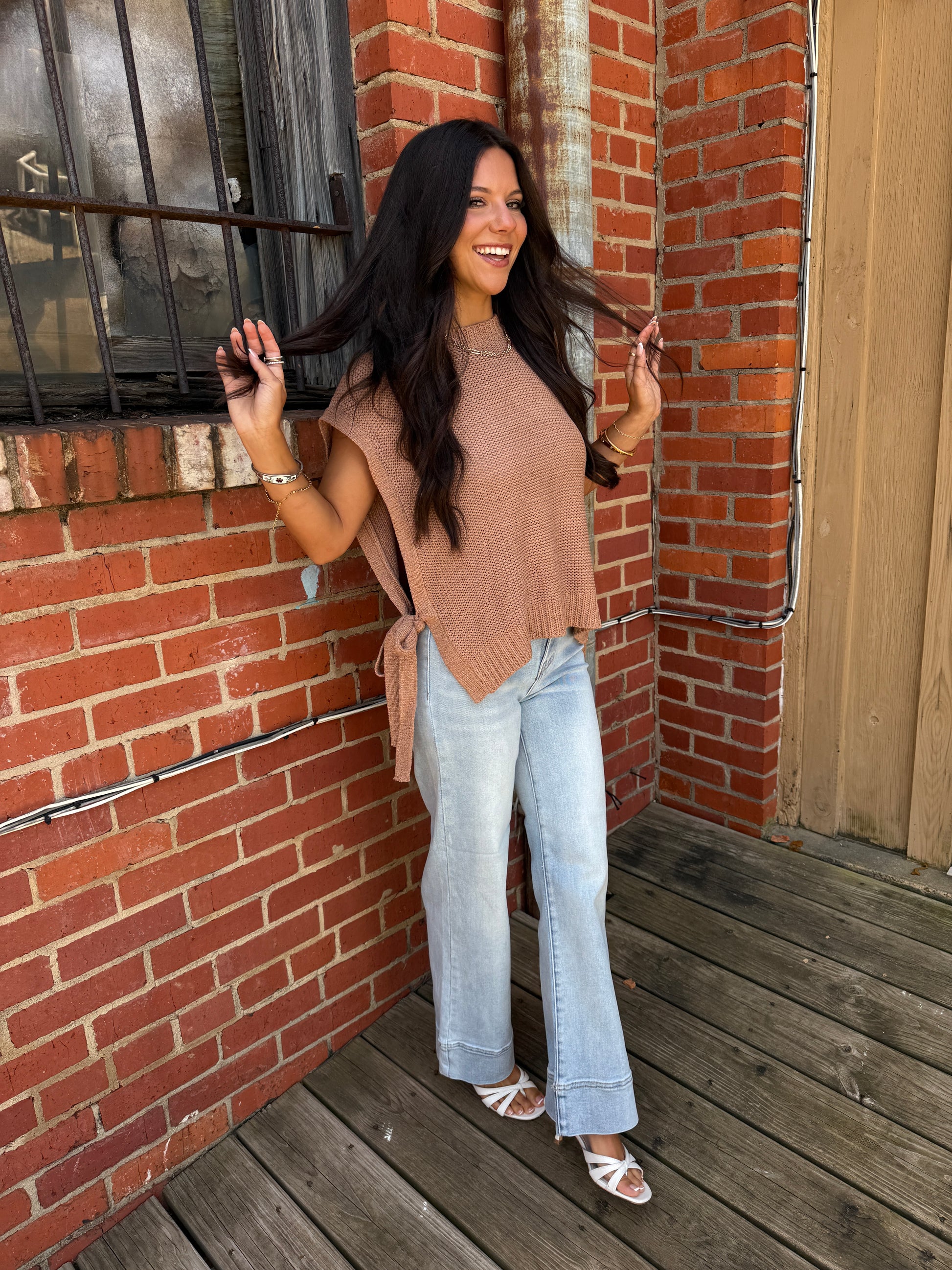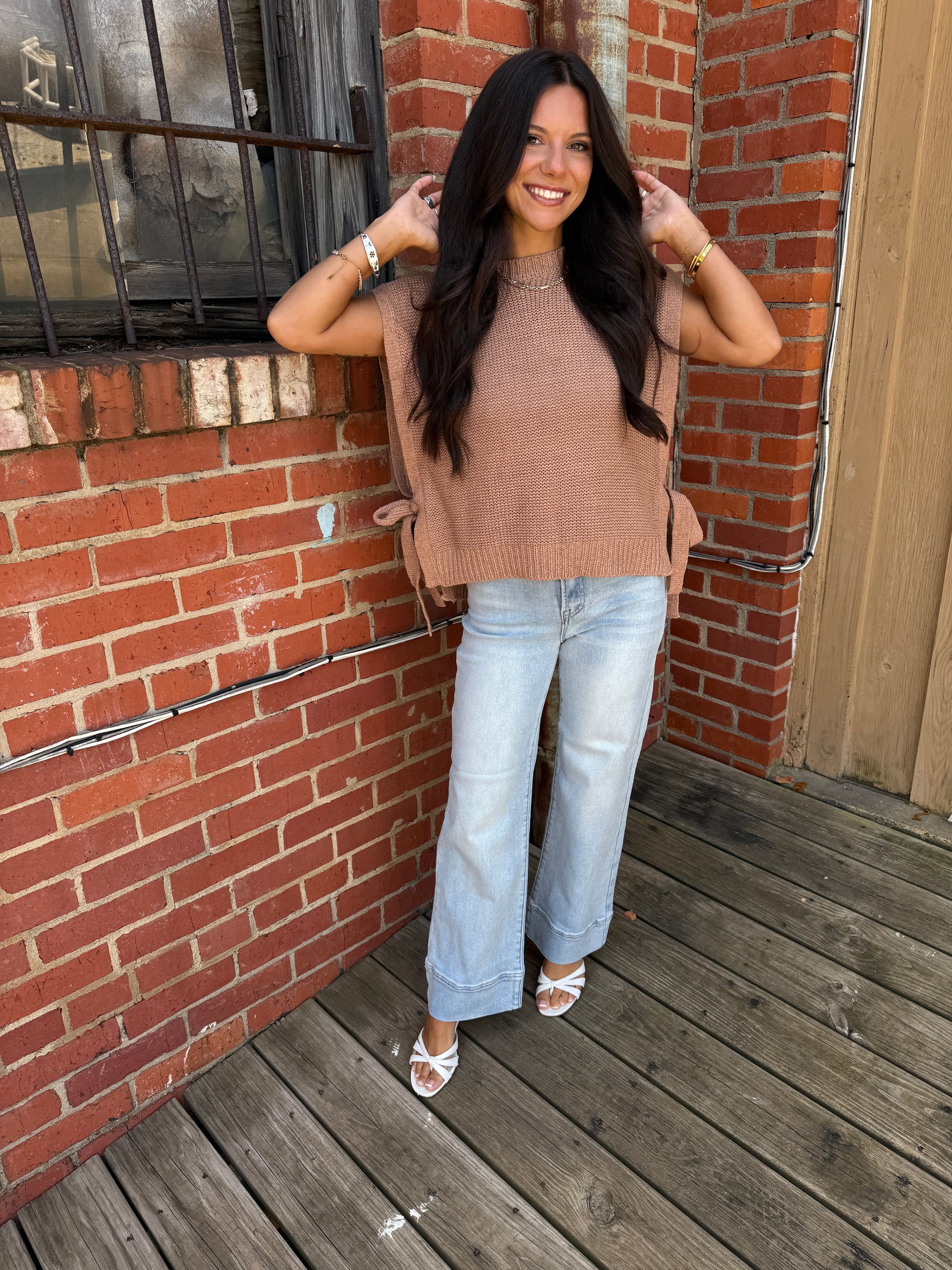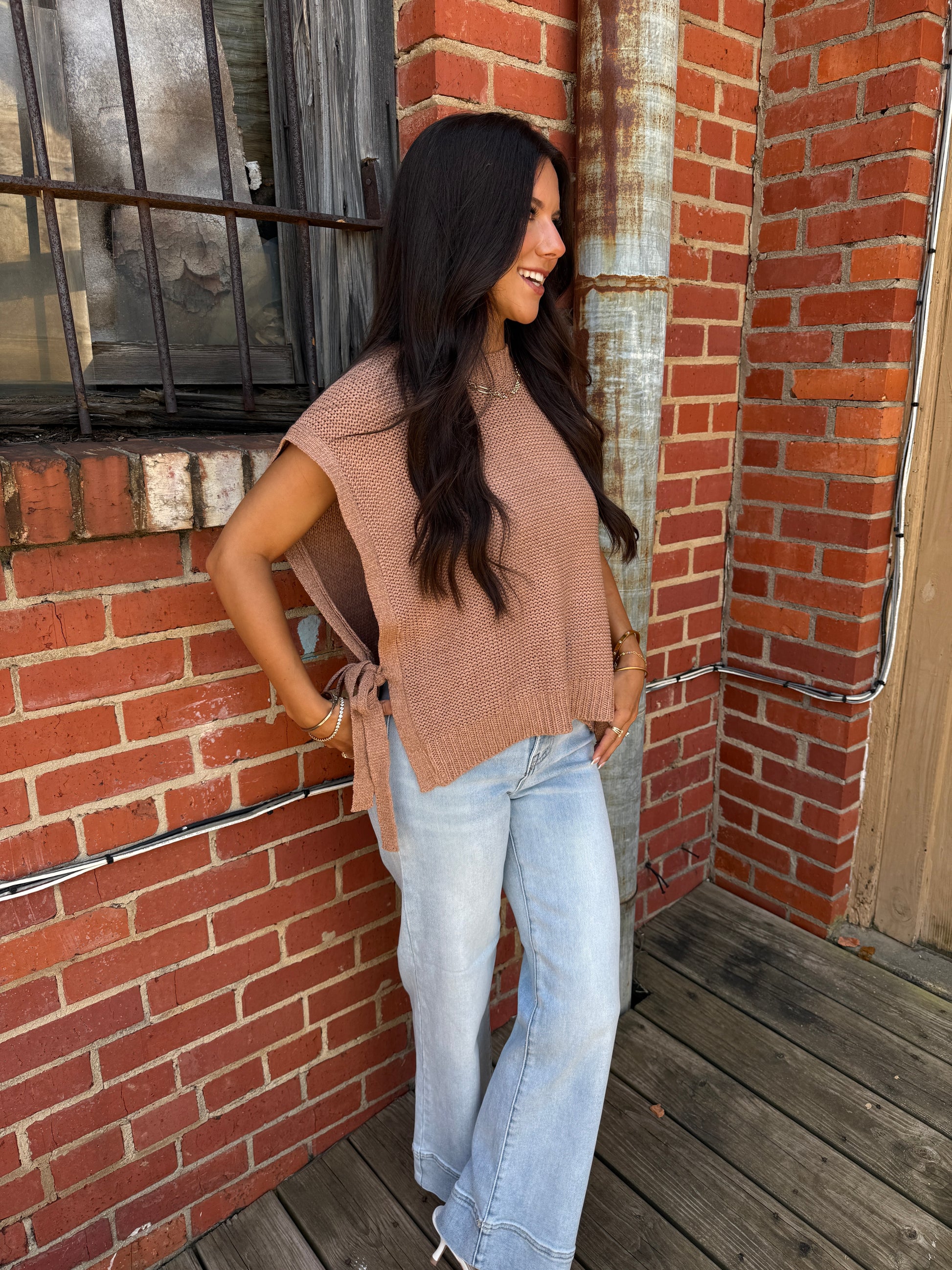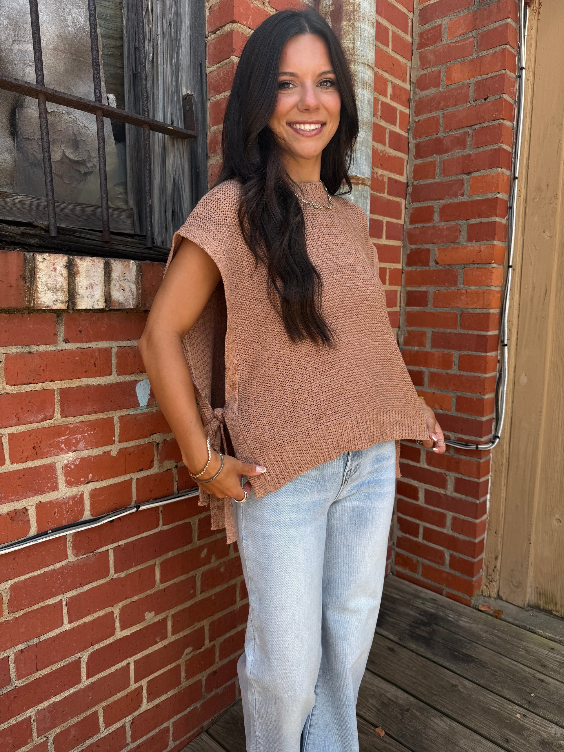 Add a splash of fun to your wardrobe with the Bad Chem Top! This frosted rosé sweater vest features charming side self-tie straps that let you customize your look with a playful twist. Perfect for layering or wearing solo, it brings cozy comfort and flirty flair together effortlessly.