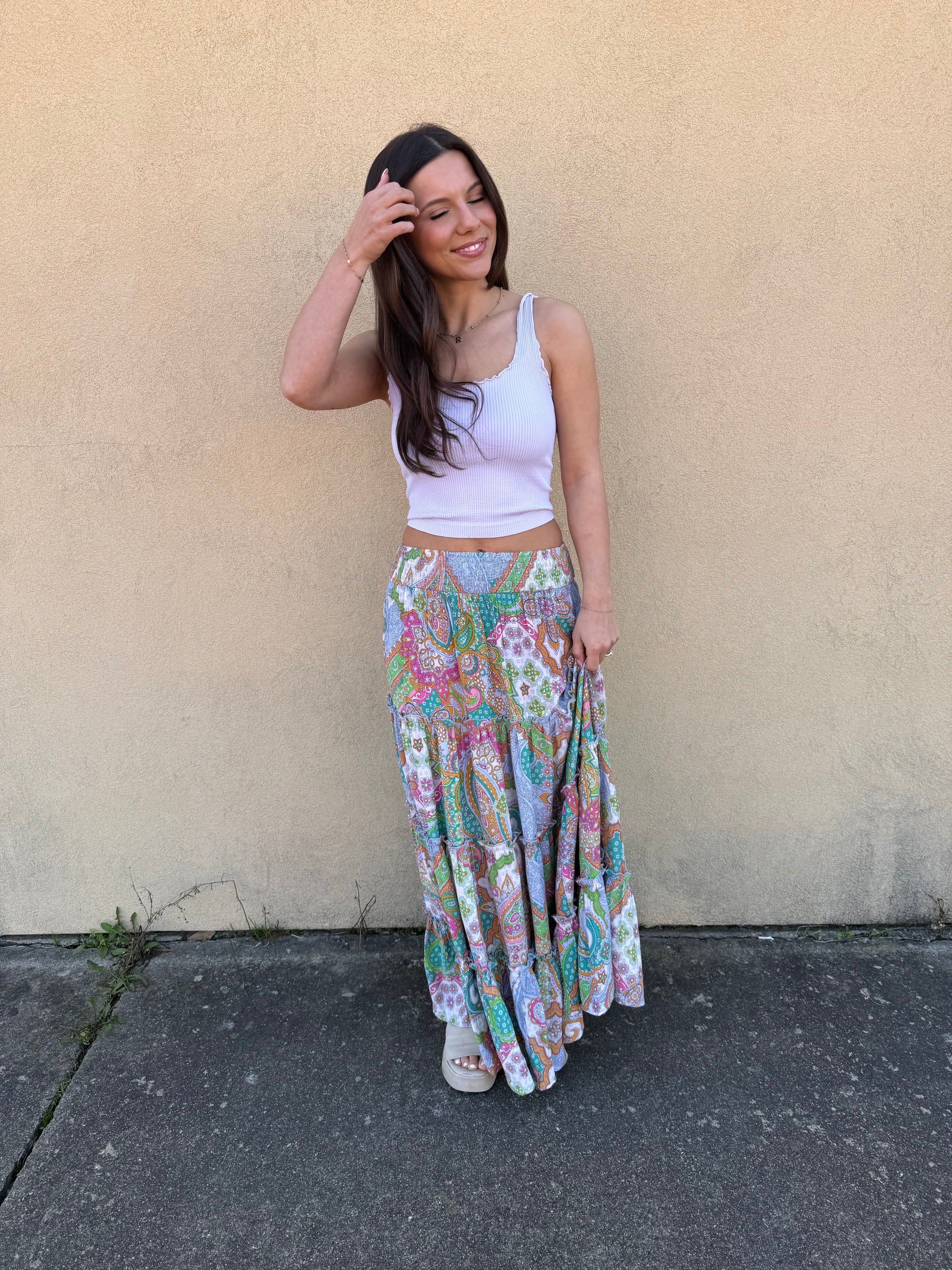 Introducing our Blossom Dream Skirt - a playful vintage addition to your wardrobe. This tiered skirt features a unique lime print of delicate peach blossoms, adding a touch of whimsy to any outfit. Bring a bit of quirky fun to your style with this must-have piece.