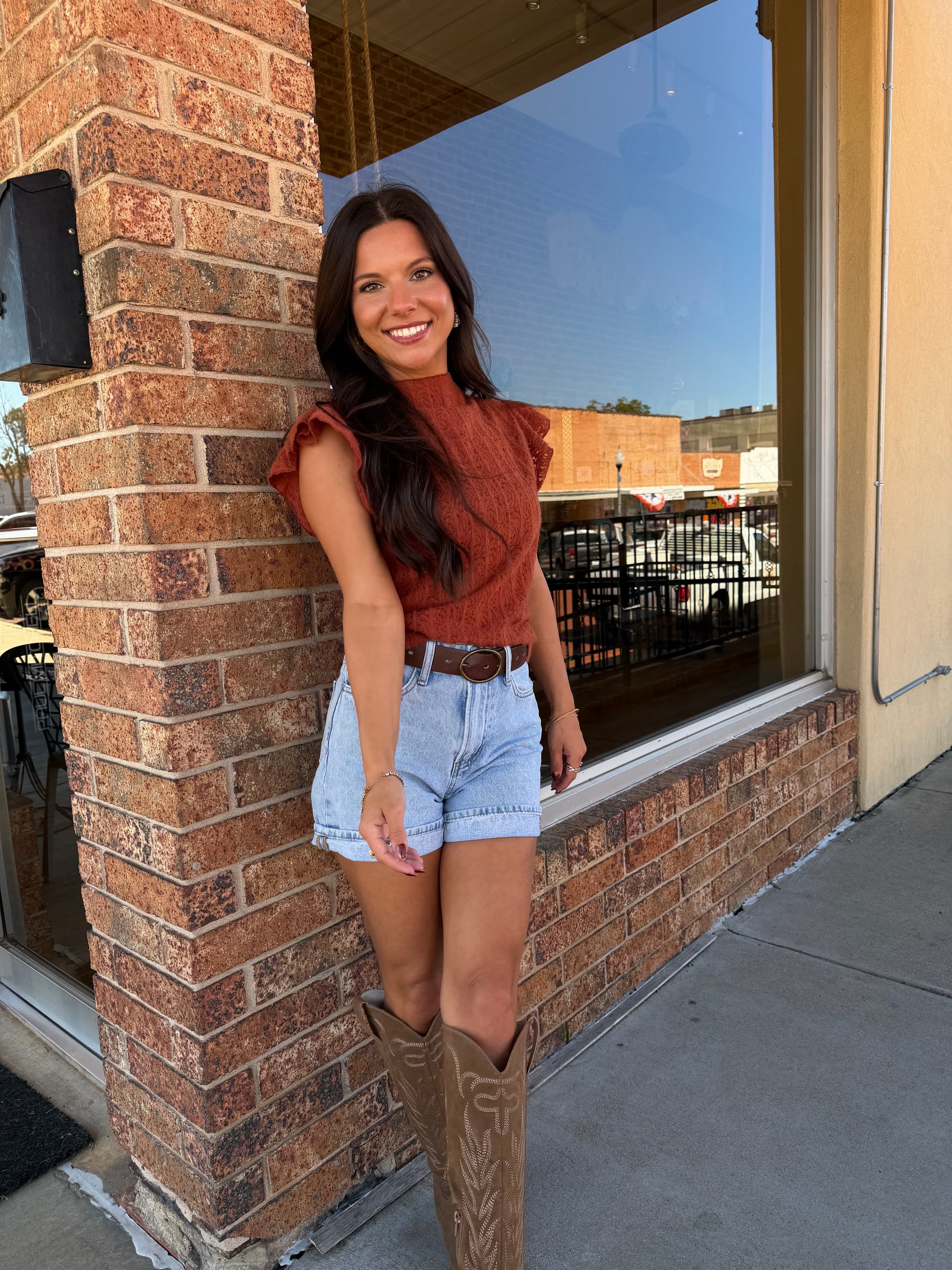 Embrace whimsy with the Caught in the Lace Top. Its soft rust hue and delicate brushed lace bring a touch of romance, while the playful ruffle sleeves and chic mock neck add flirty flair. Perfect for layering or shining solo, this top turns everyday moments into a charming style story.