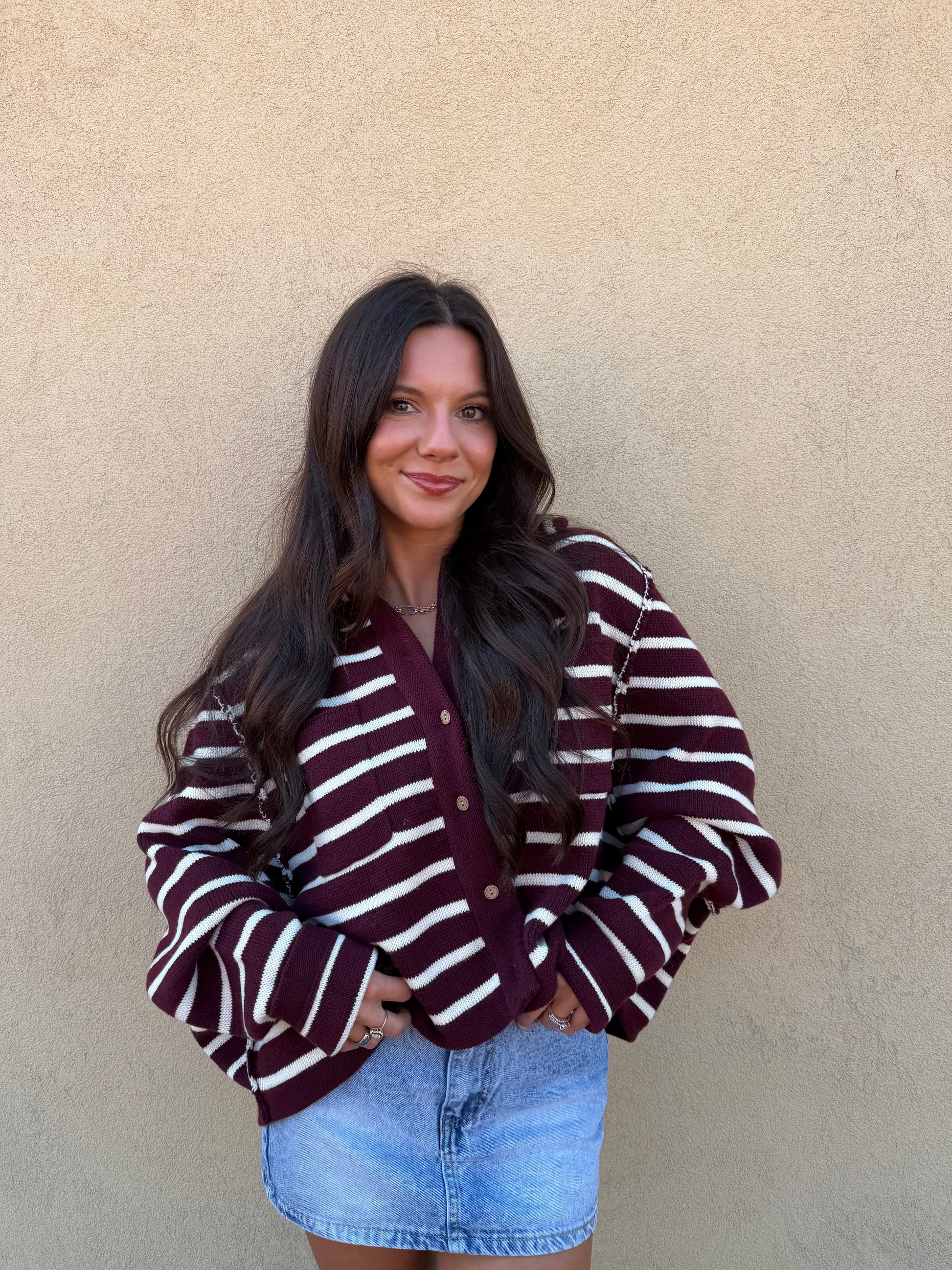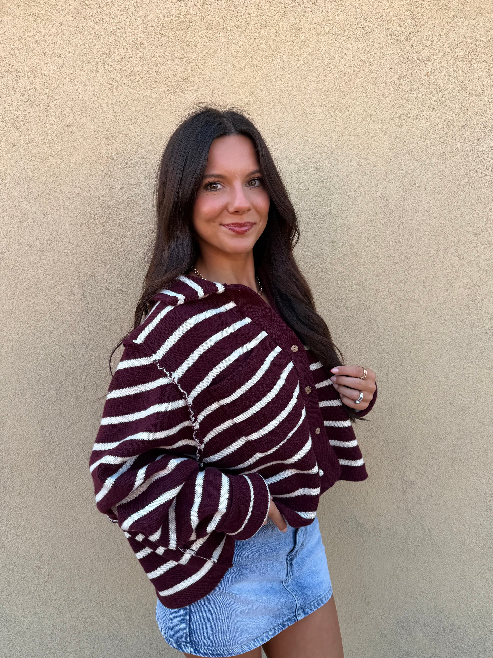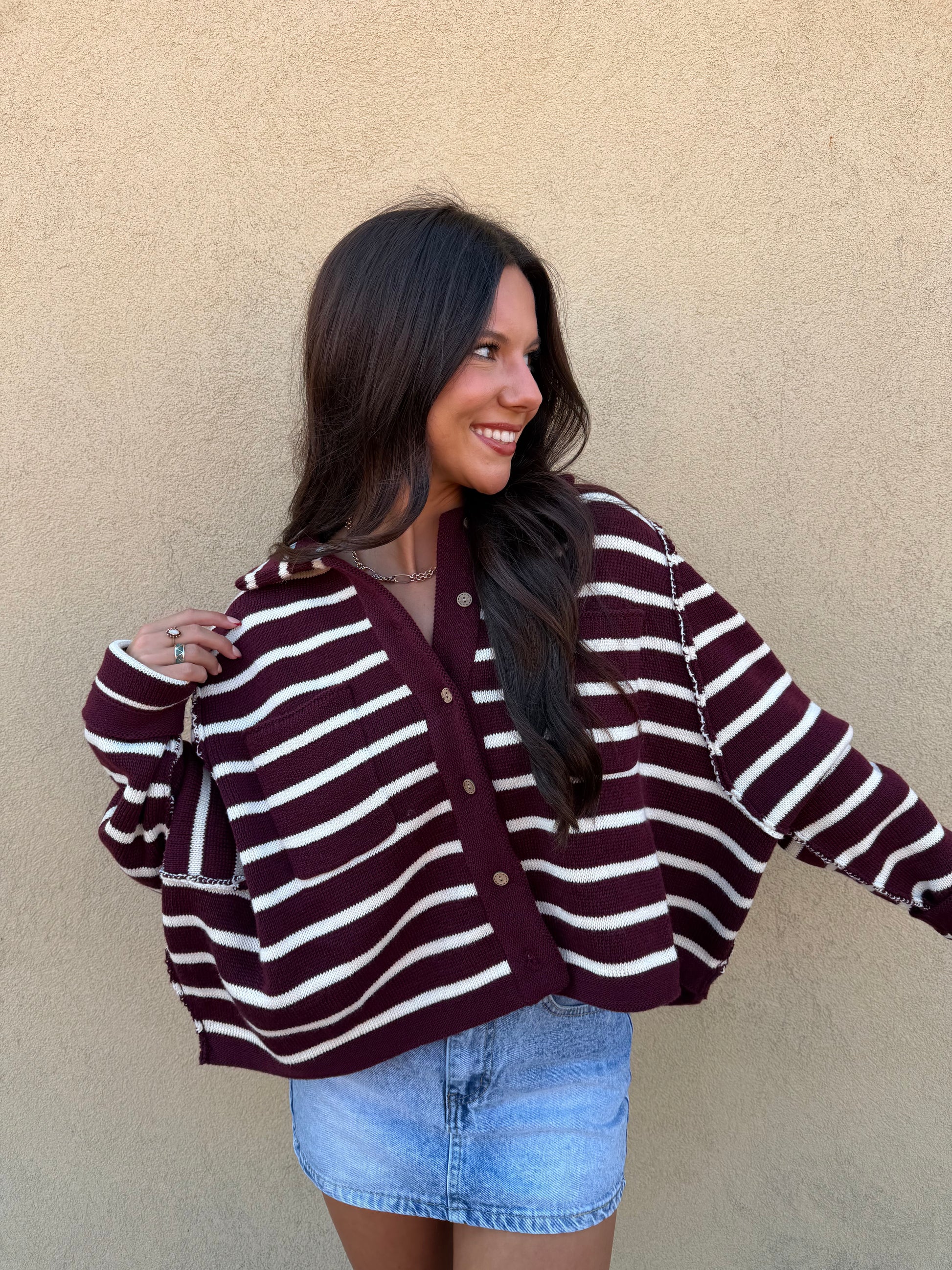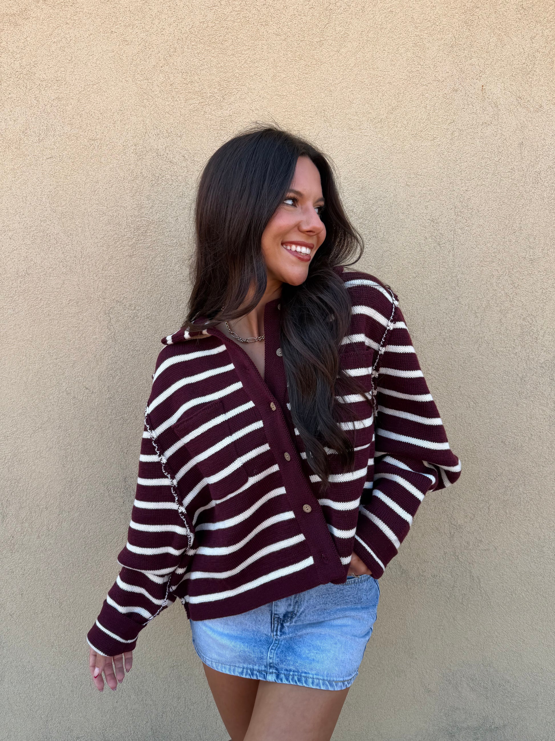 Brighten your wardrobe with the Conceited Top! This playful knit features maroon and cream stripes, a classy collar, and handy front pockets. Button it up for a chic look that’s as fun as it is functional. Perfect for mixing comfort with a splash of personality!