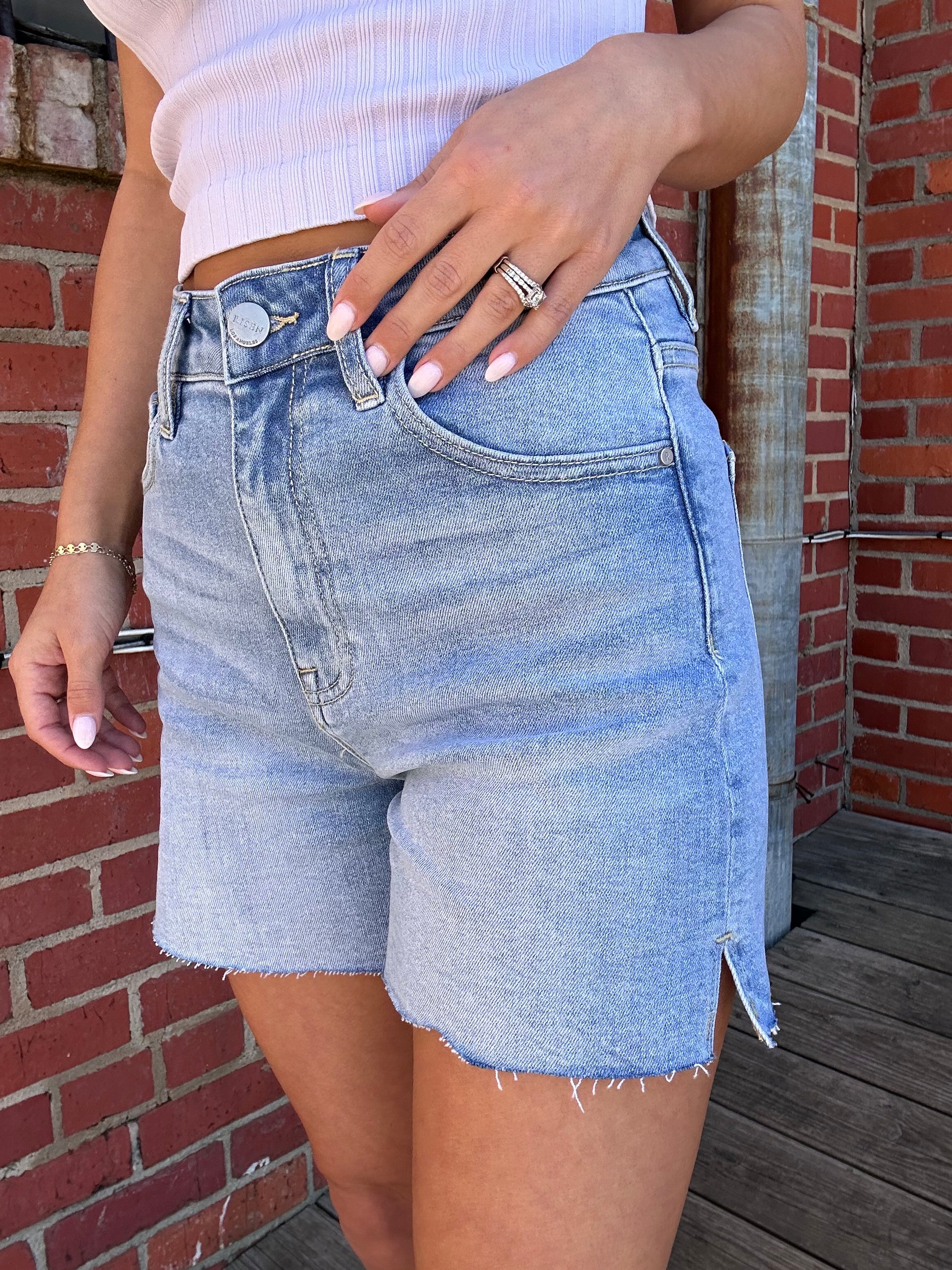 Show off your legs and your style with Cottage Cut off shorts. With a high rise, these light wash shorts will flatter your figure while the raw cut hem and side slit add a touch of edge. Perfect for warm weather days (or setting trends)!