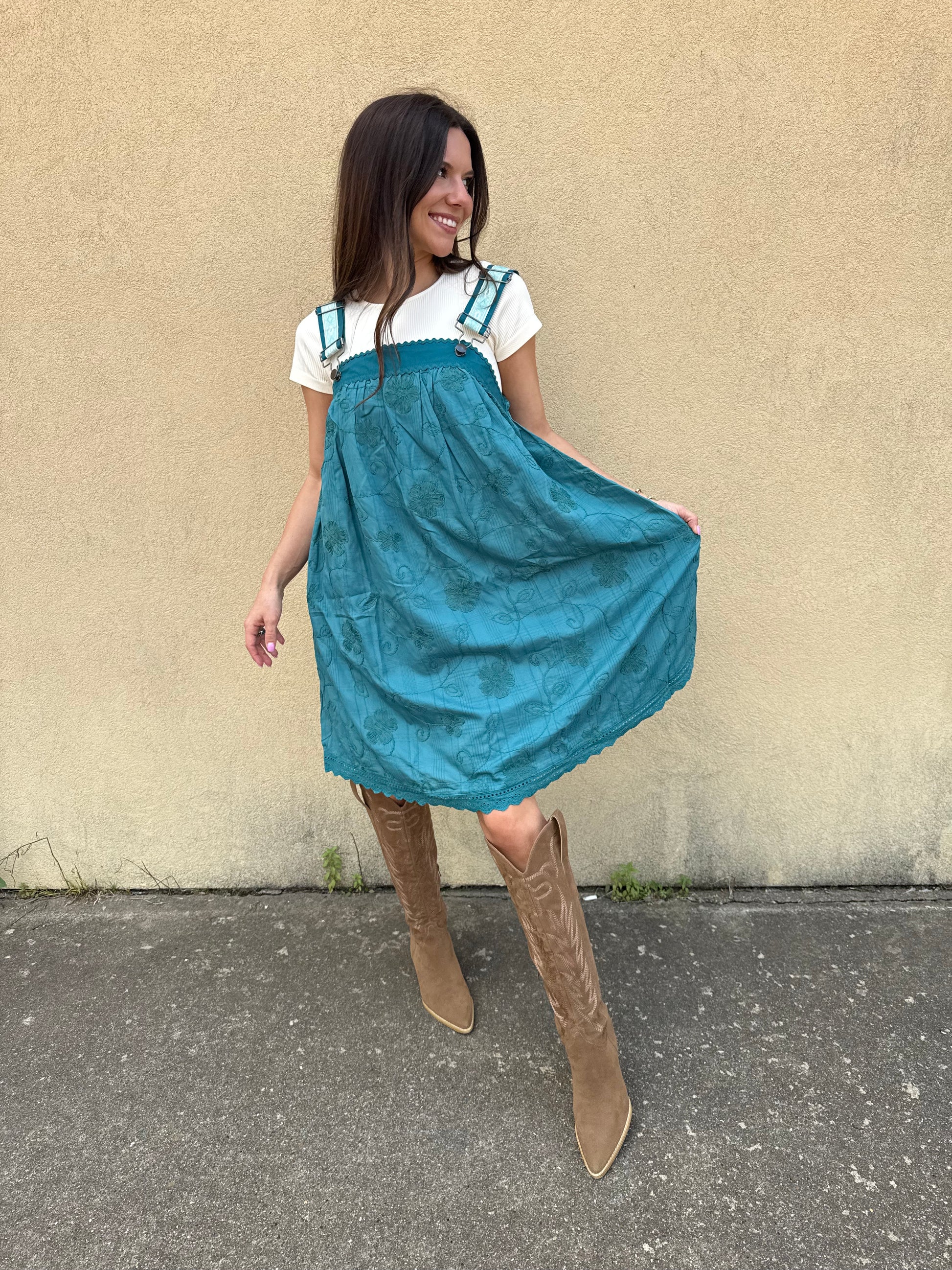 Introducing our newest obsession, the Cottage Tide Overall Dress. With a romantic teal green embroidered design, this dress will make you stand out in any crowd. Perfect for a day at the beach or a night out with friends. Be prepared to turn heads in this unique and playful piece!