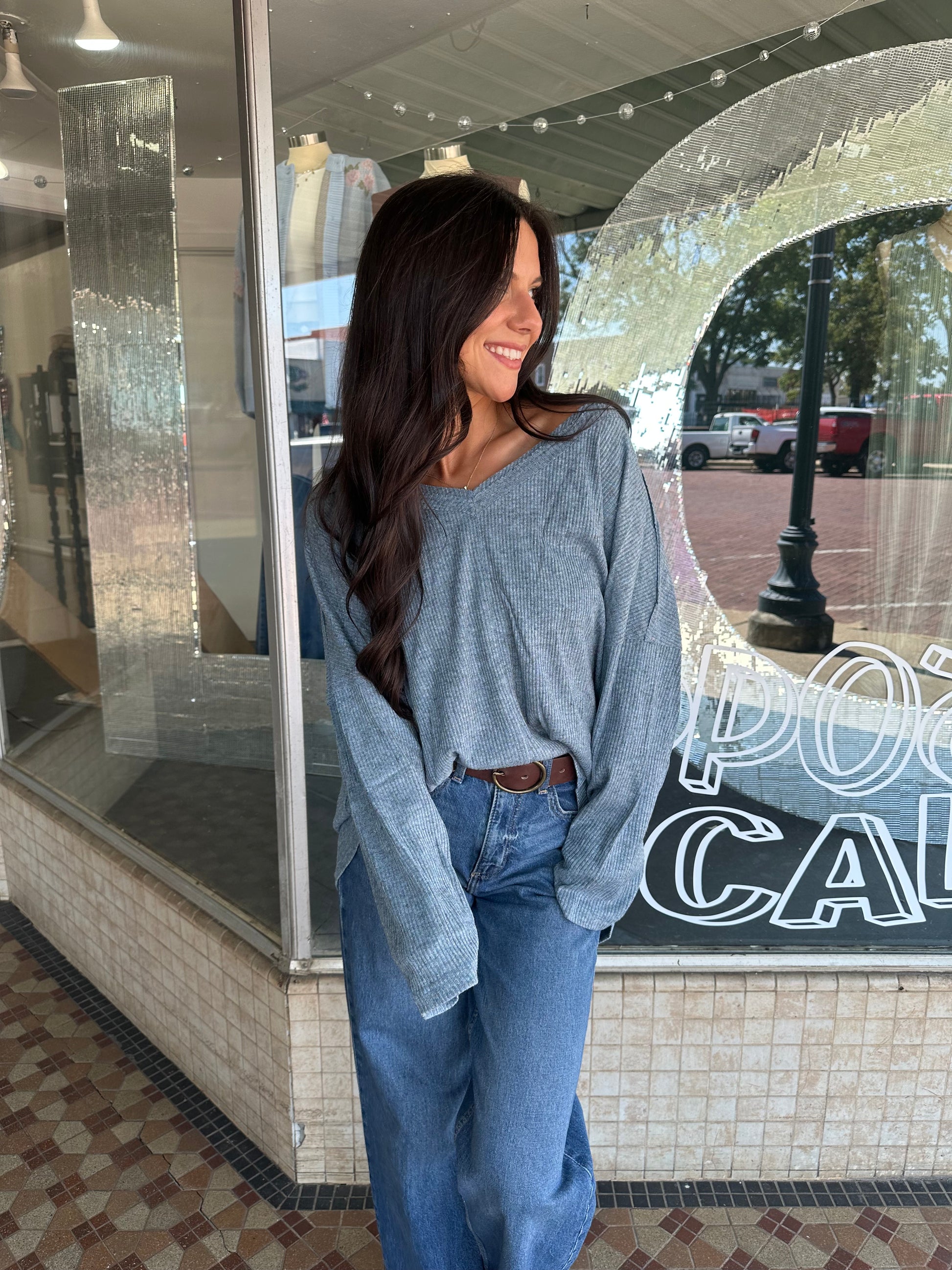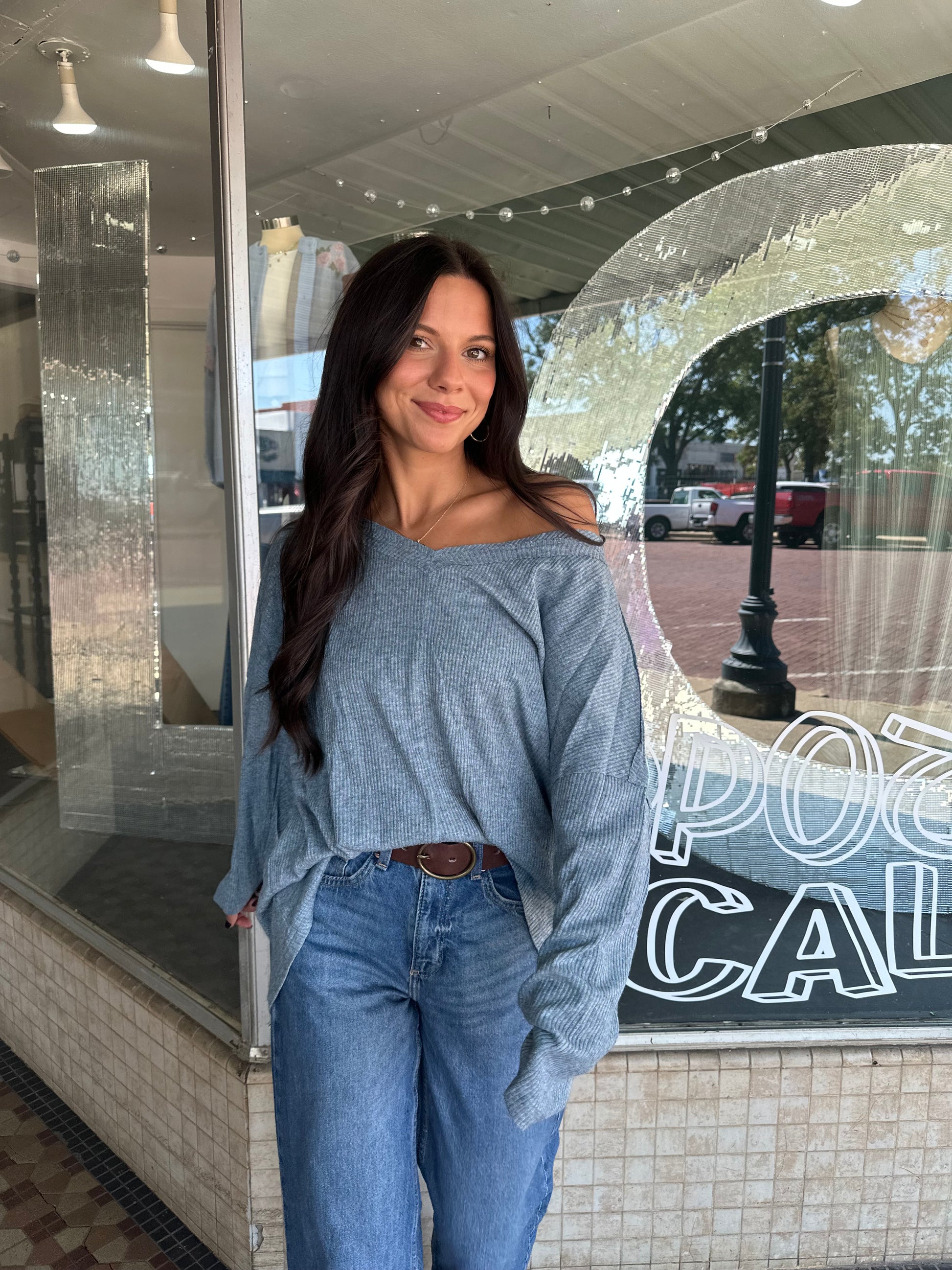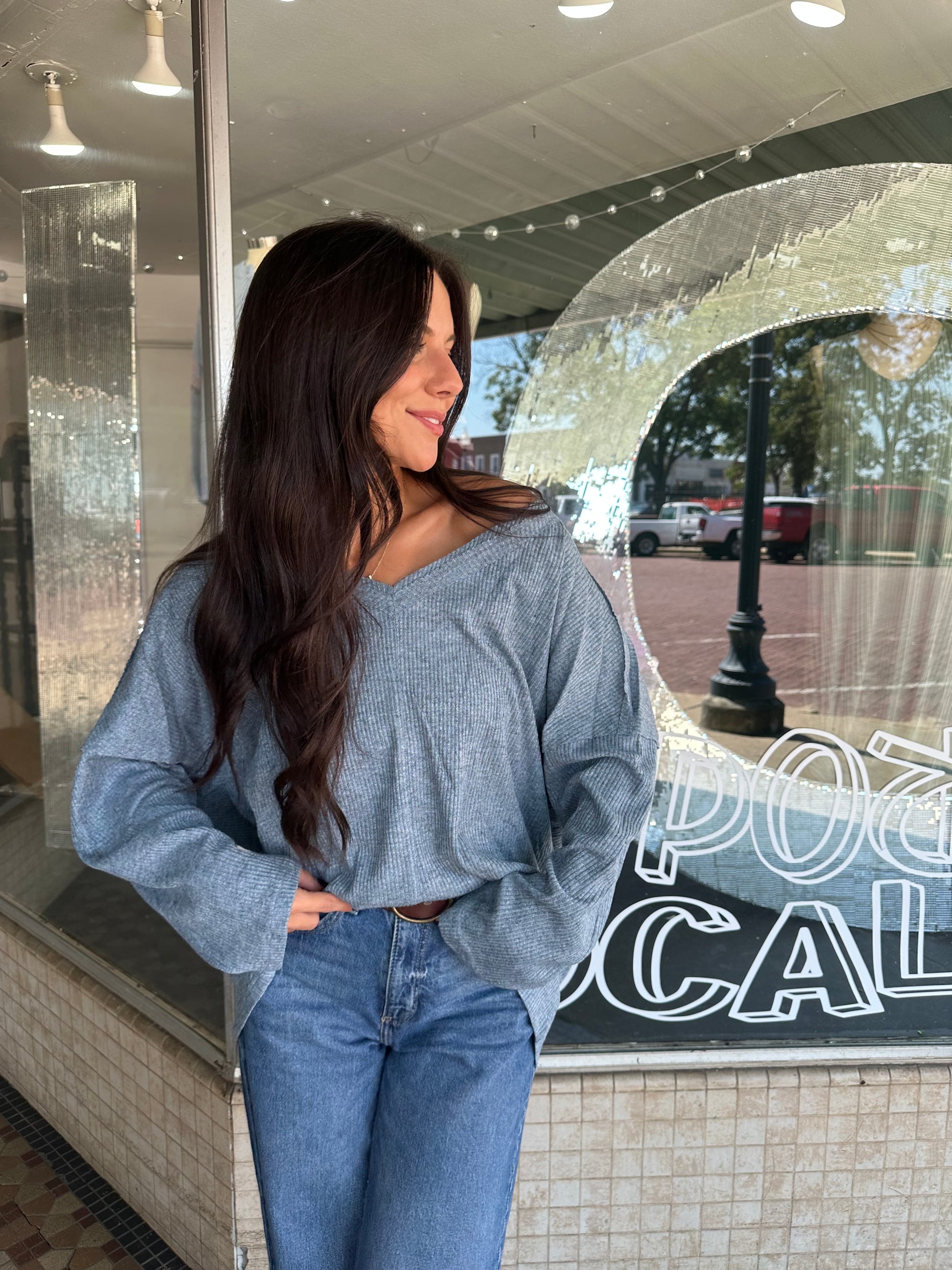 Step out in style with the Cover Me Up top—a vintage-inspired blue oversized tunic featuring a cozy ribbed texture and a playful V-neck. Perfect for layering or wearing solo, this easygoing piece combines comfort and charm, giving you a relaxed yet chic look for any casual day.