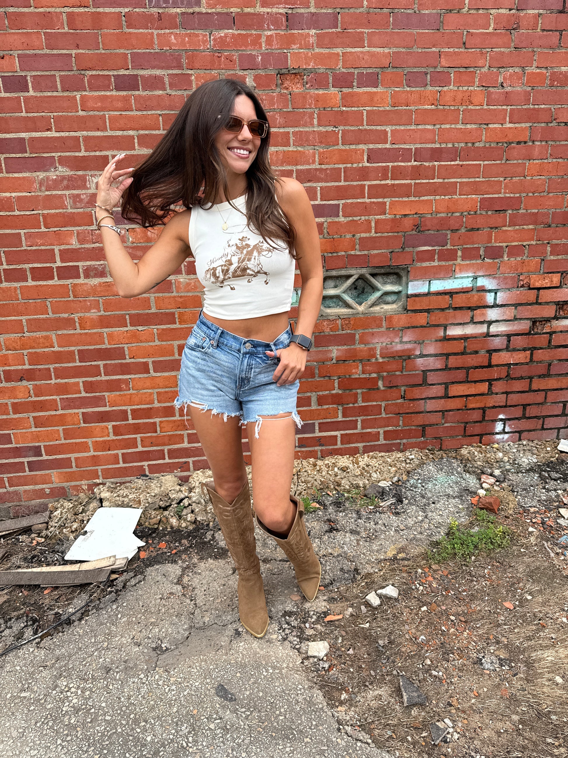 This playful cream sleeveless crop top features a charming western print, perfect for adding a touch of cowboy flair to your summer wardrobe. Its knit fabric offers a comfortable, breathable fit, making it ideal for warm days and casual outings. Pair it with your favorite jeans or skirts for an effortlessly stylish look.