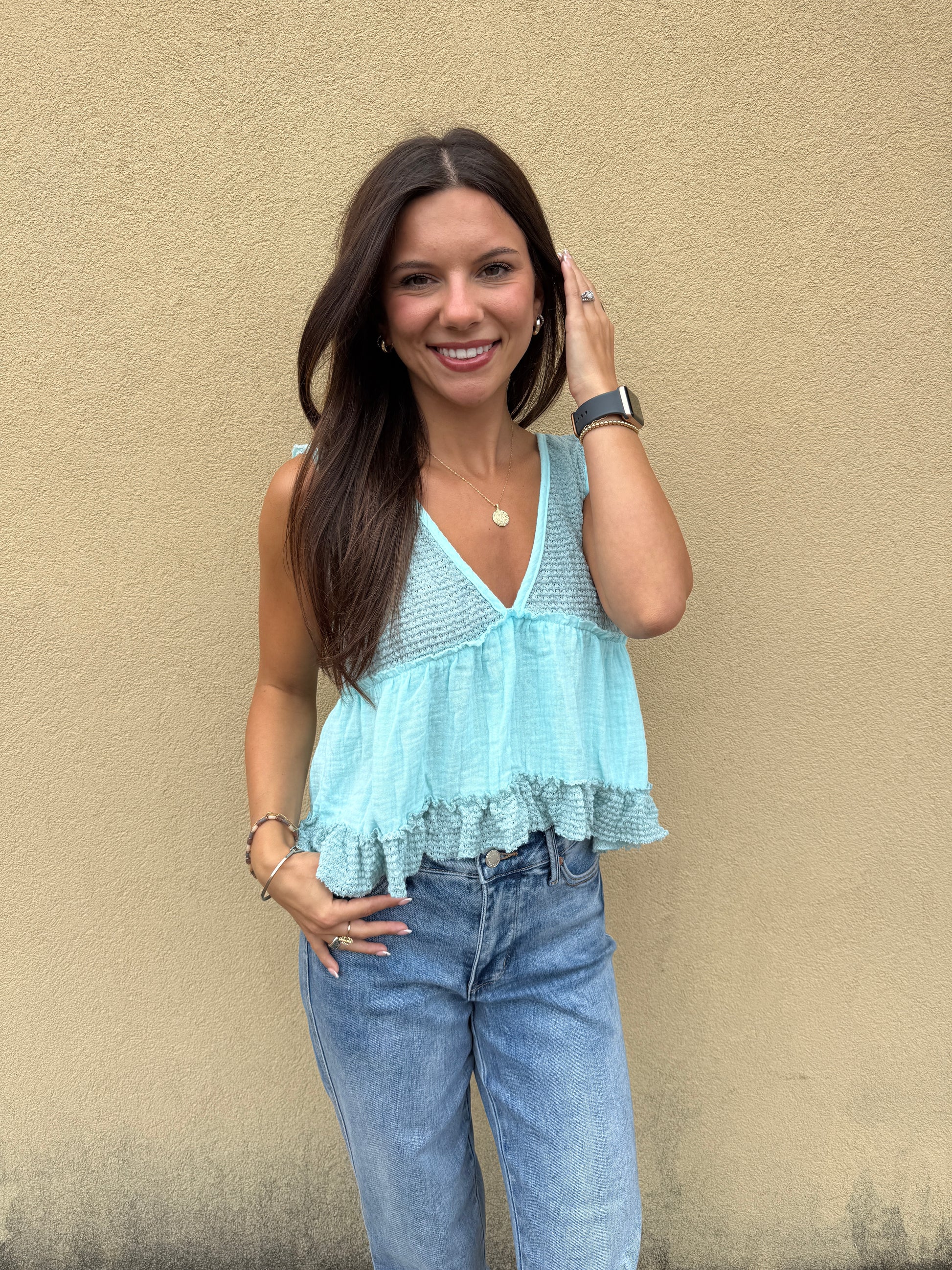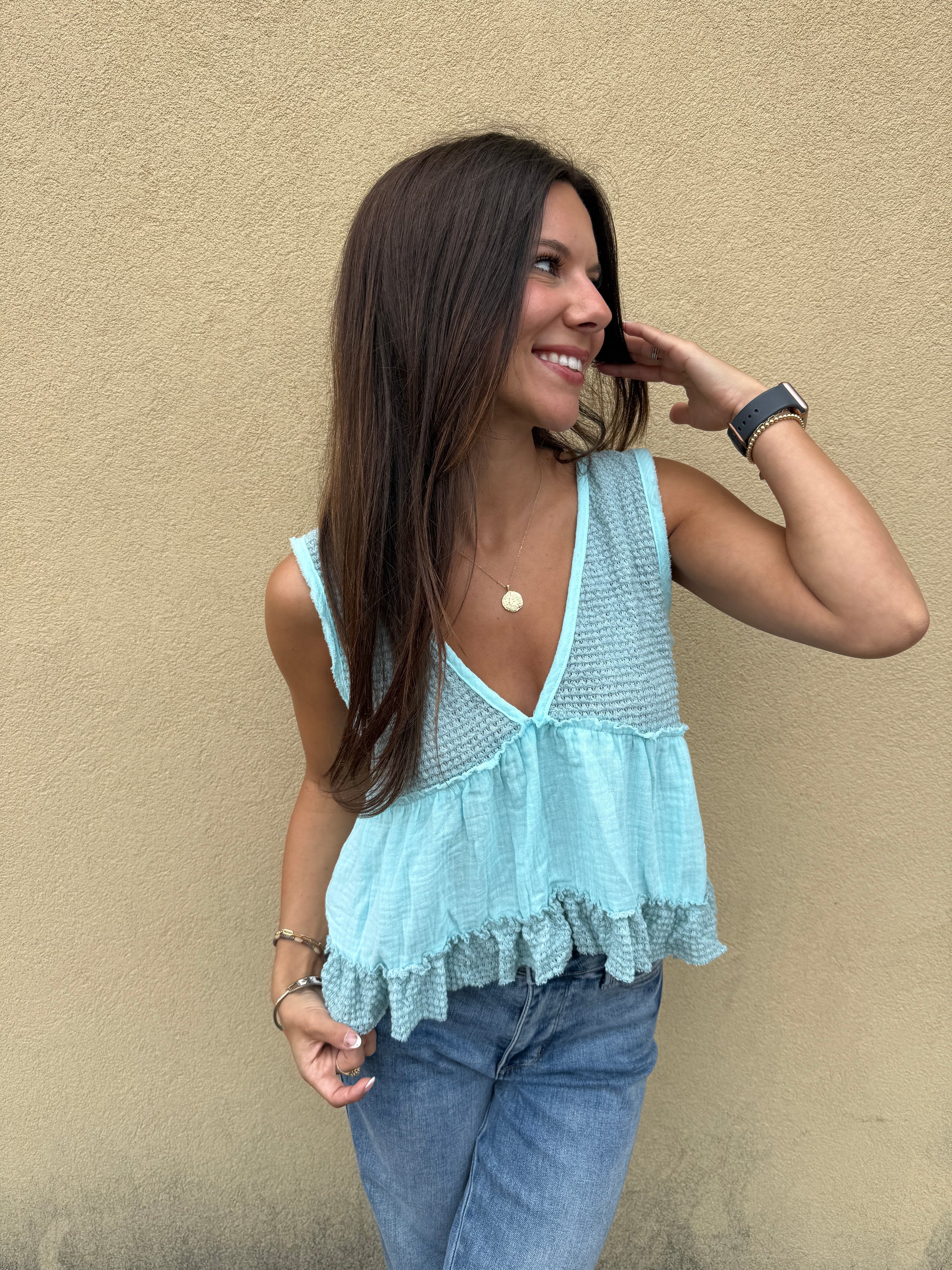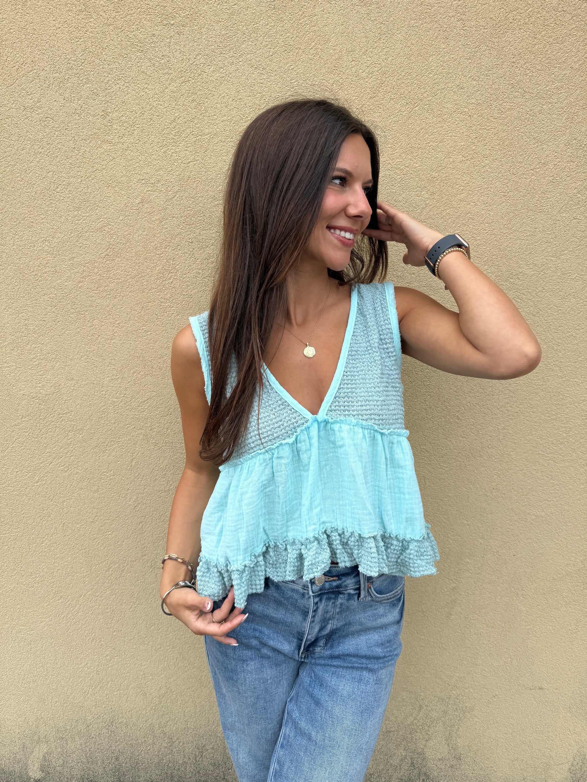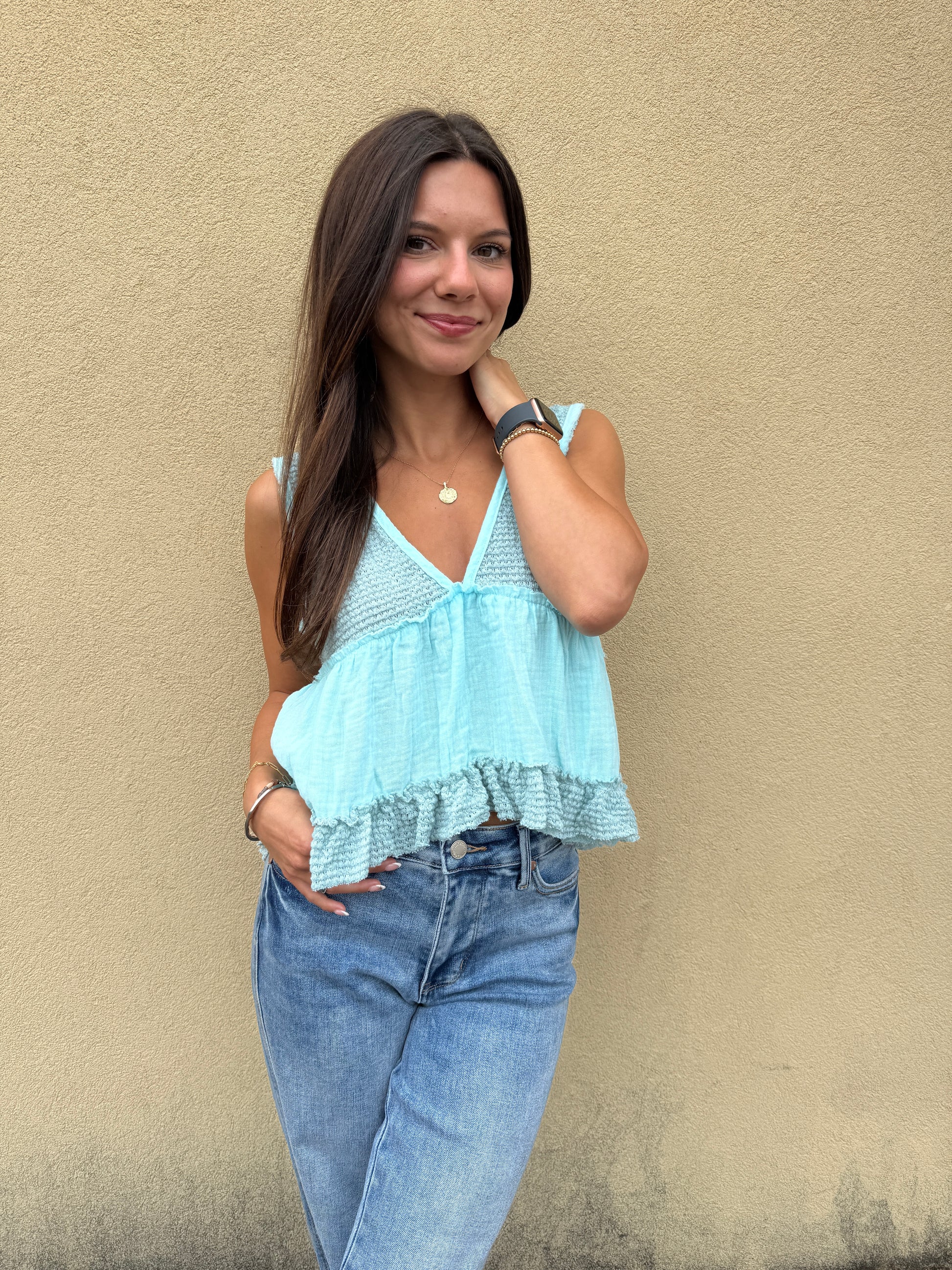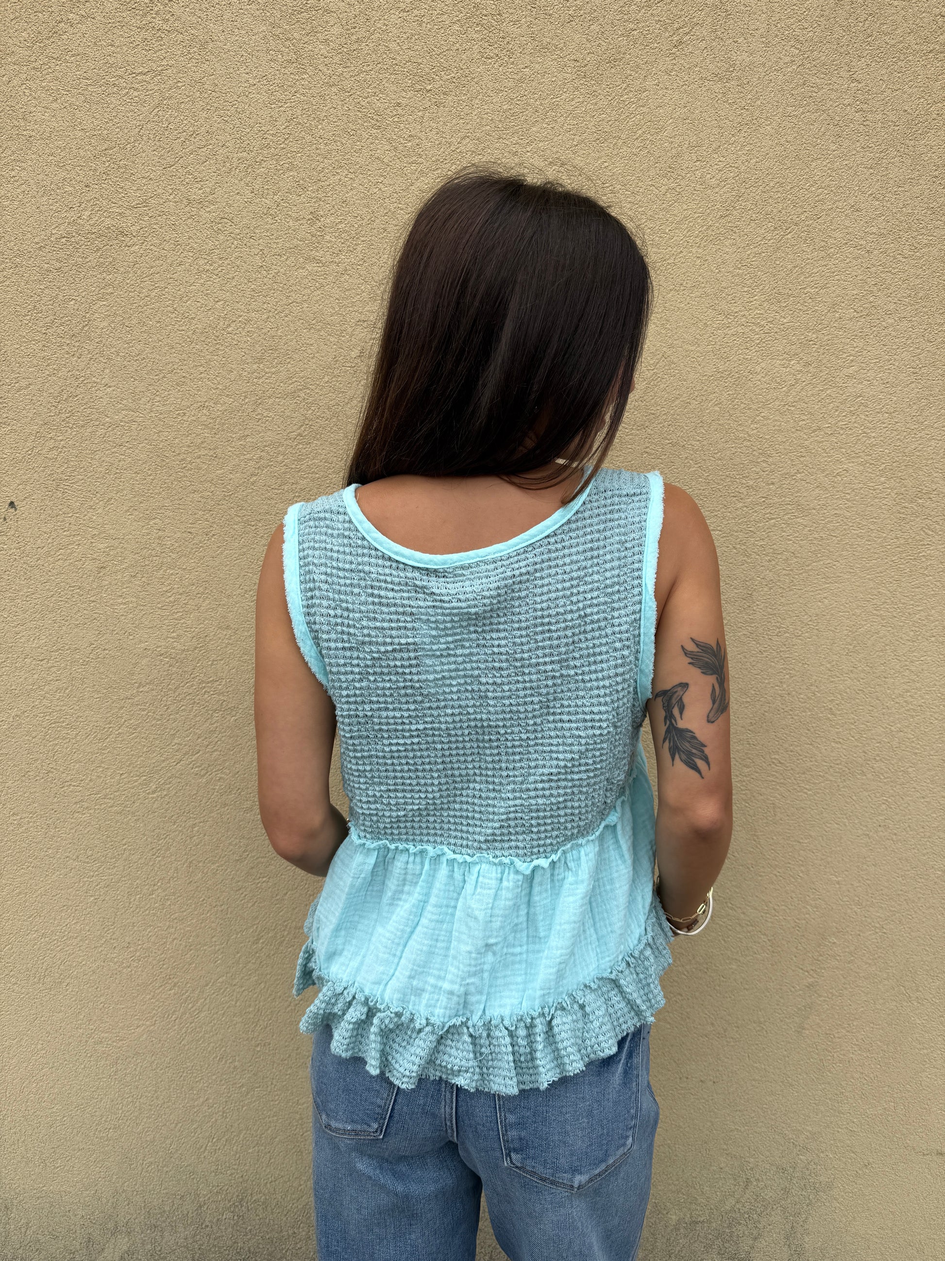 Slip into summer vibes with this adorable baby blue sleeveless thermal top! The playful contrast stitching adds character to this cropped babydoll silhouette. Perfect for sunny days when you want to stay cool while turning heads with your effortlessly cute style.