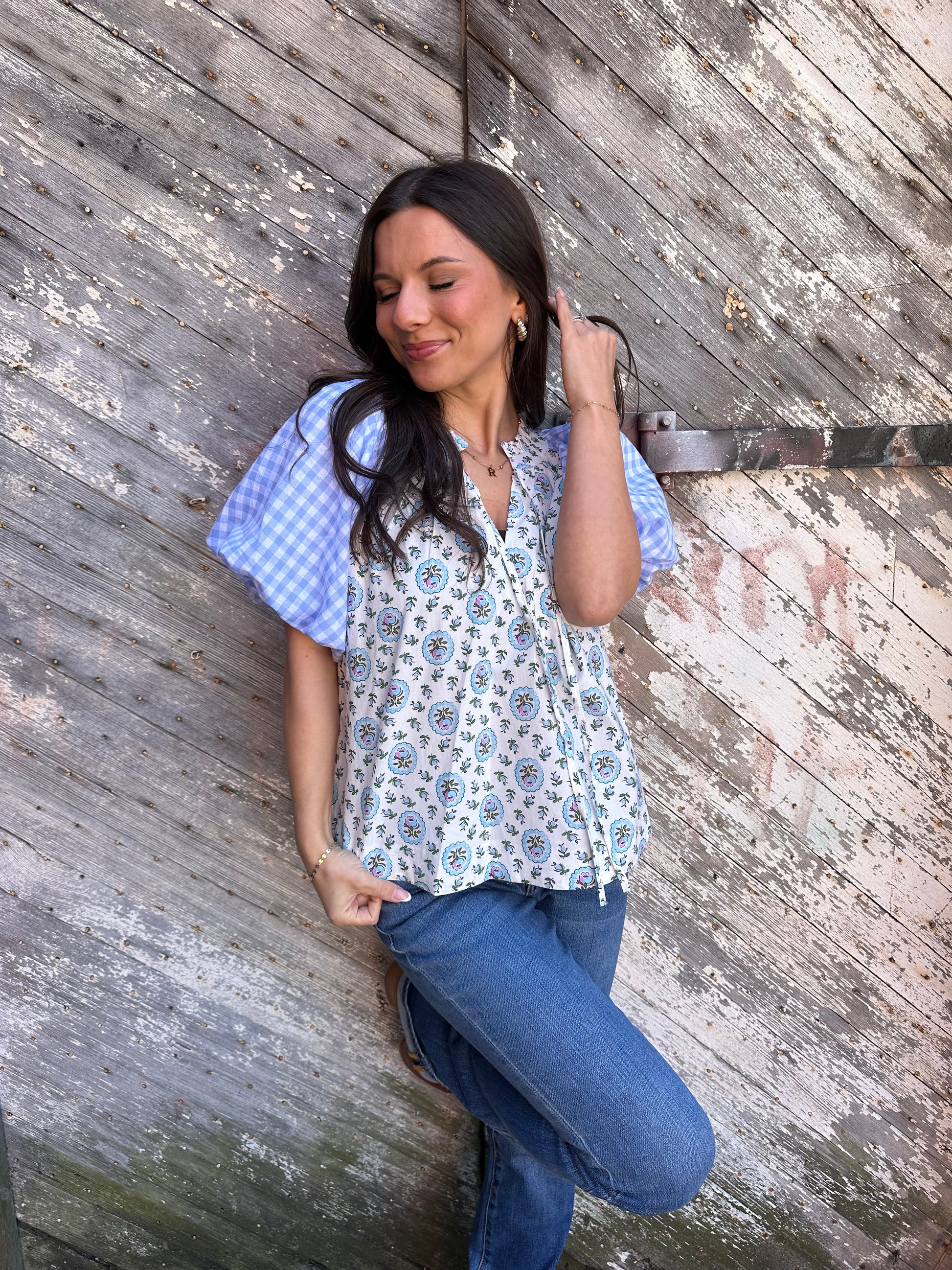 Make a statement with our Floral Fling Top! This top features a contrasting print bubble sleeve top in a beautiful baby blue color. Perfect for flinging around town in style.