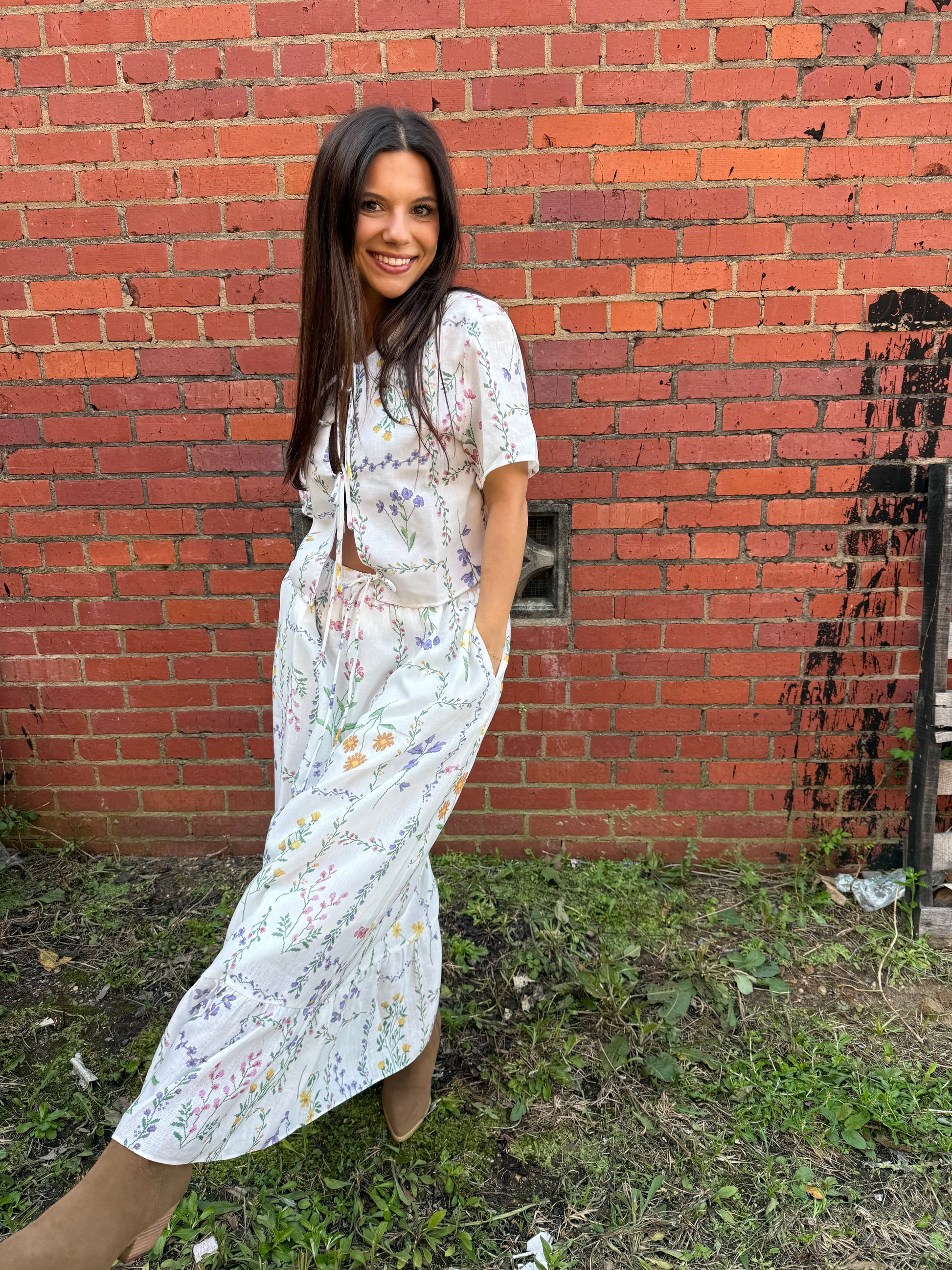 Embrace your inner bohemian goddess with our Folkcore Skirt! This white maxi skirt is adorned with a vibrant floral print, perfect for embracing your playful side. Let the colors pop as you dance through fields of flowers and turn heads wherever you go. (Flowy, floral, and fabulous!)