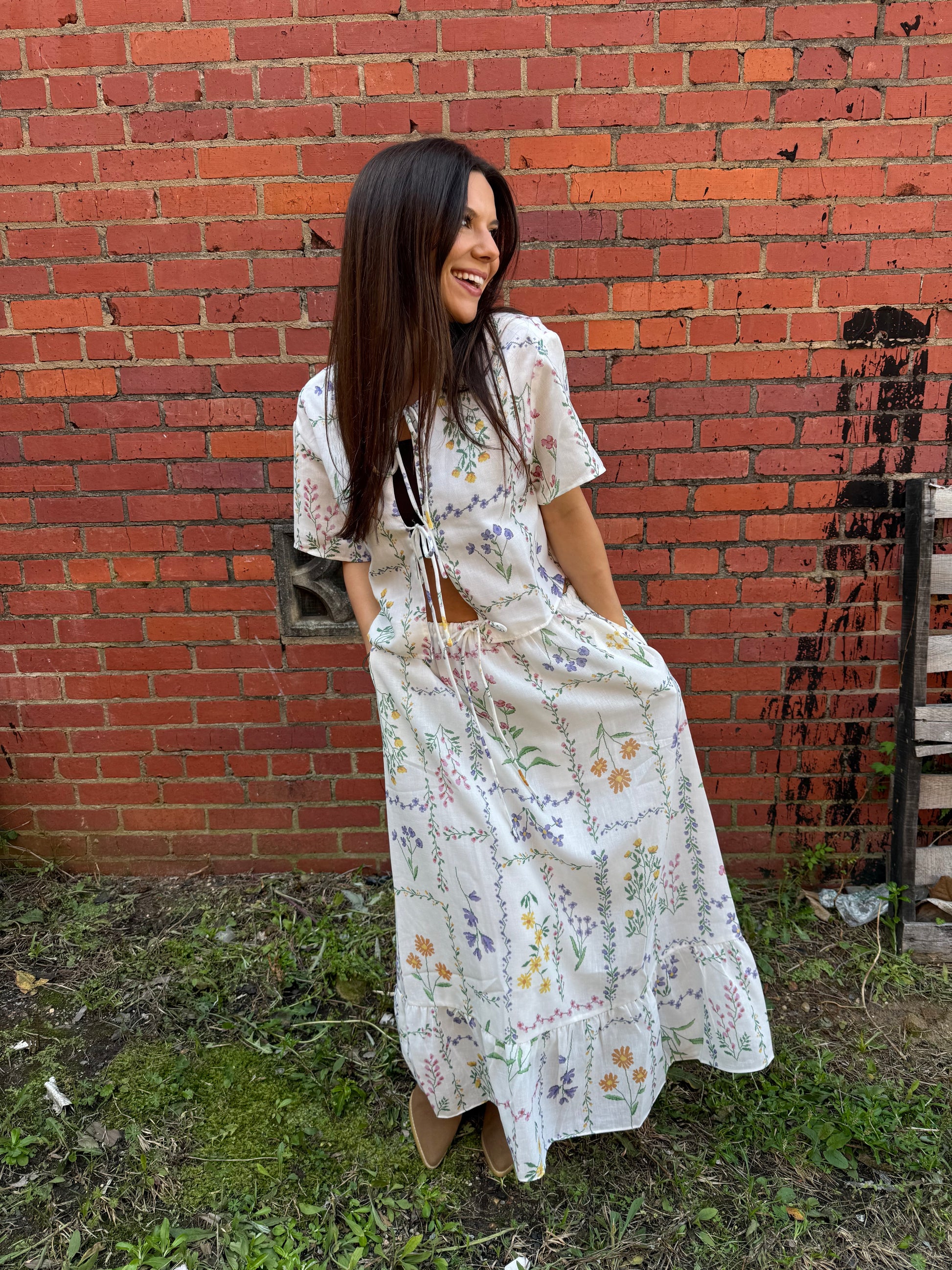 Flaunt a charming and playful style with the Folkcore Tie Top! This white multi floral print top features short sleeves and a front tie, creating a unique and trendy look. Perfect for adding a touch of quirkiness to any outfit.
