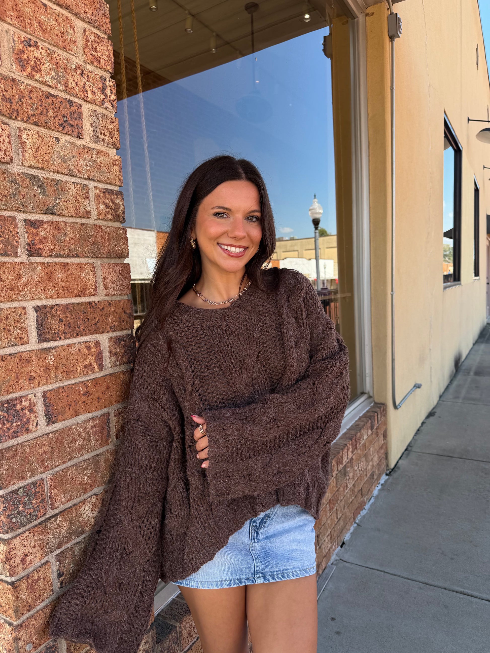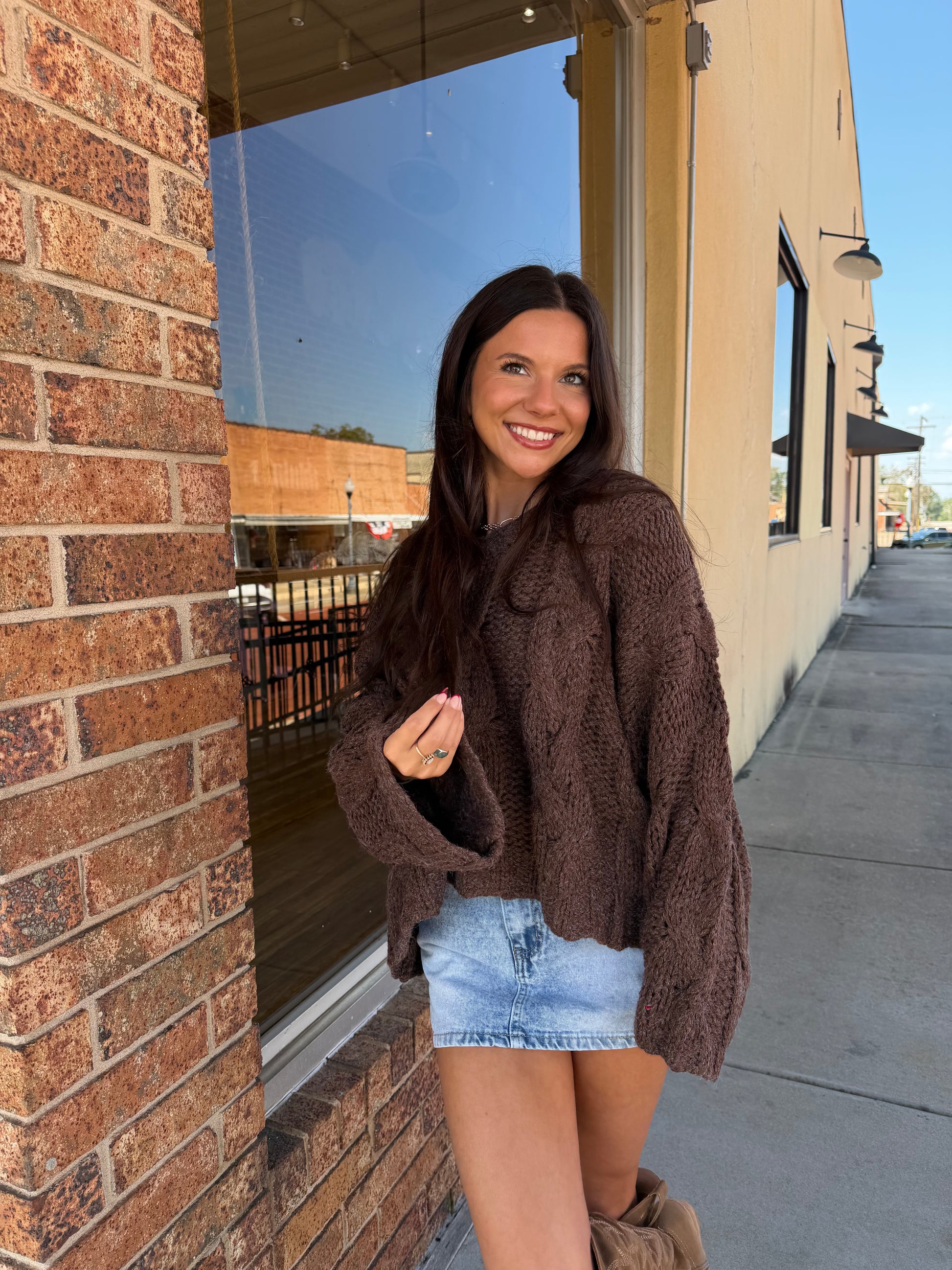 Wrap yourself in cozy charm with the Foolish Top, a chestnut oversized chunky knit sweater featuring a flirty V-neck. Perfect for layering or lounging, its playful silhouette adds a dash of fun to your casual look while keeping you warm and comfy all day long.