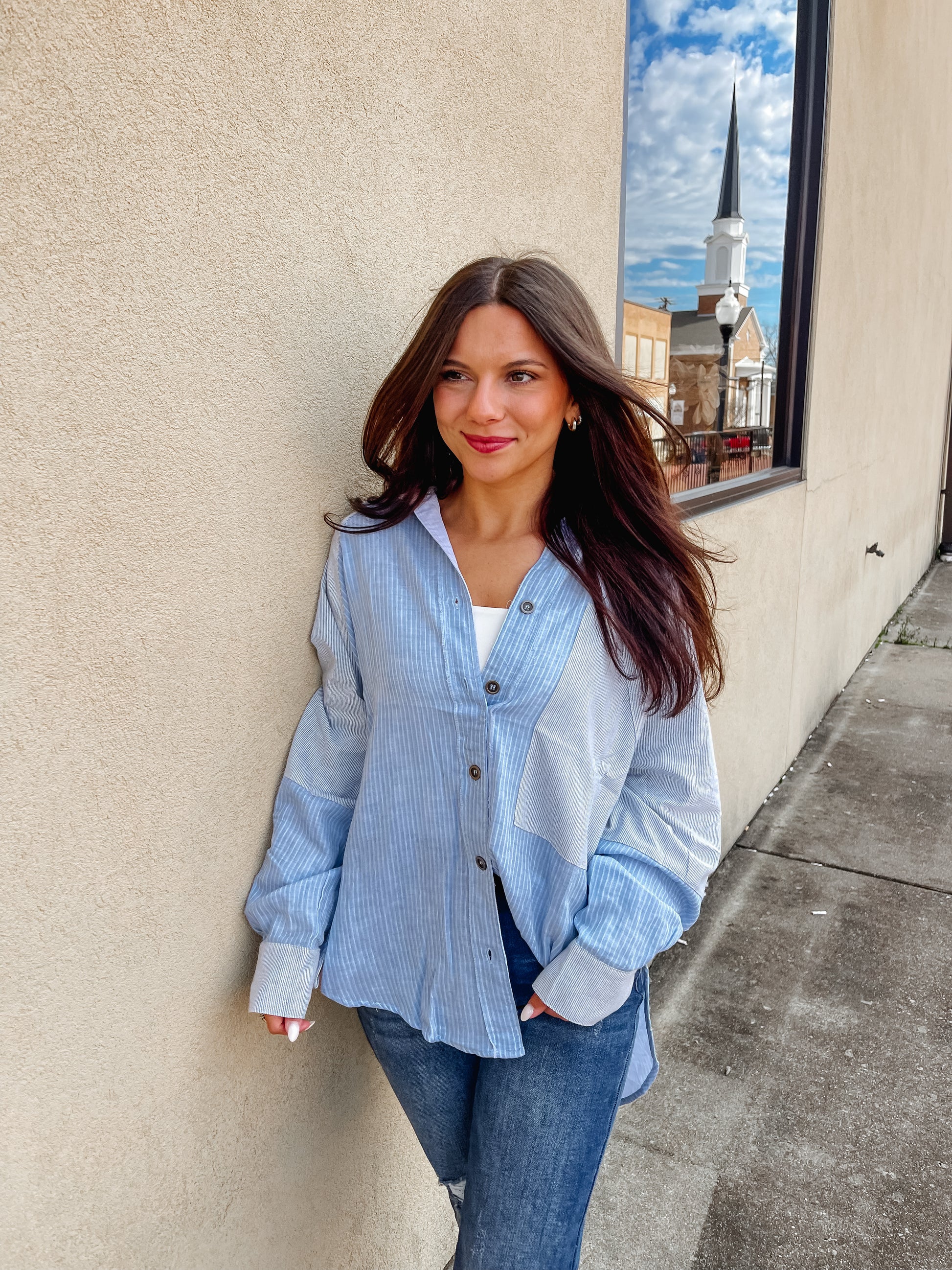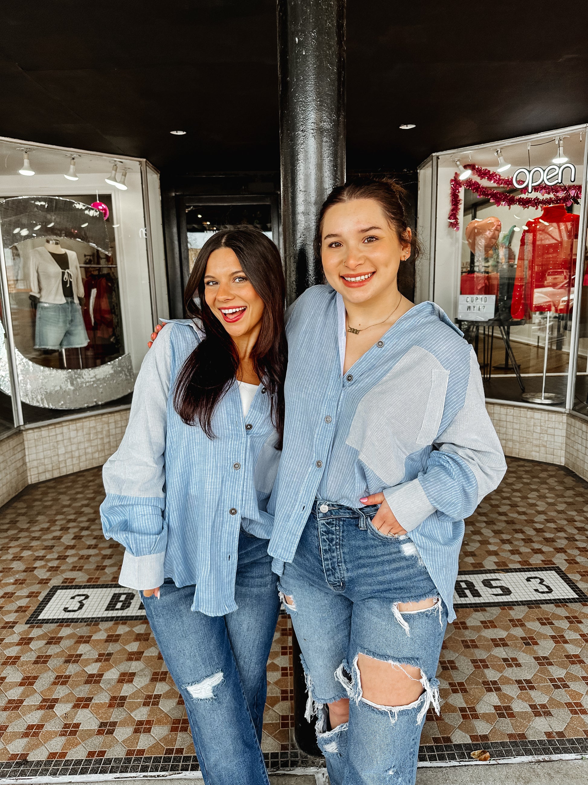 Sky blue Delilah top is a stylish variation of the classic button-up shirt, featuring panels or sections of different fabrics or textures strategically placed for a unique and eye-catching design.