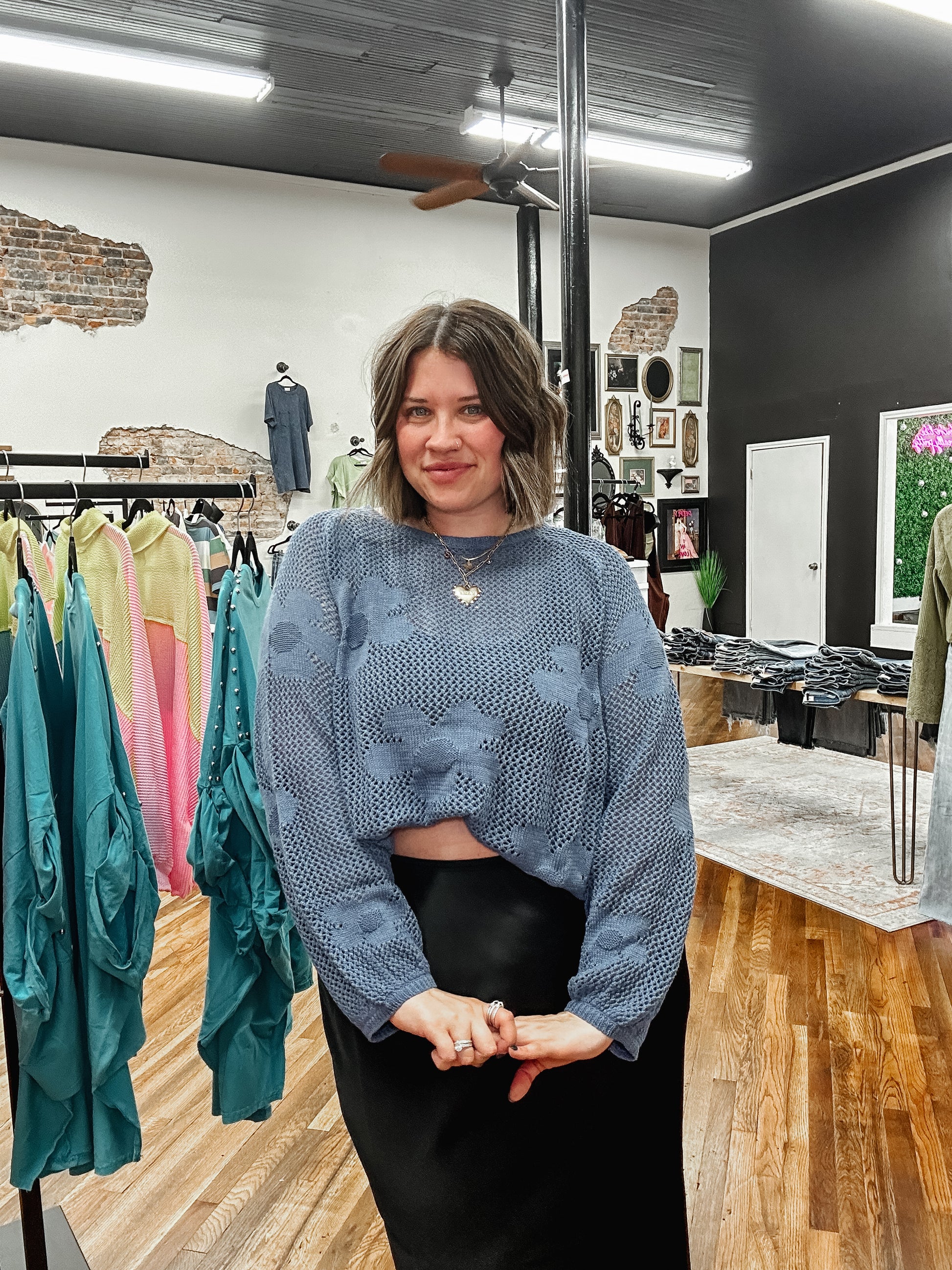 Get ready to escape to your garden oasis in this playful knit top! Made from a soft, green fabric and adorned with charming floral details, this top is perfect for adding some quirk and fun to your wardrobe. So go ahead, let your inner flower child bloom in style!
