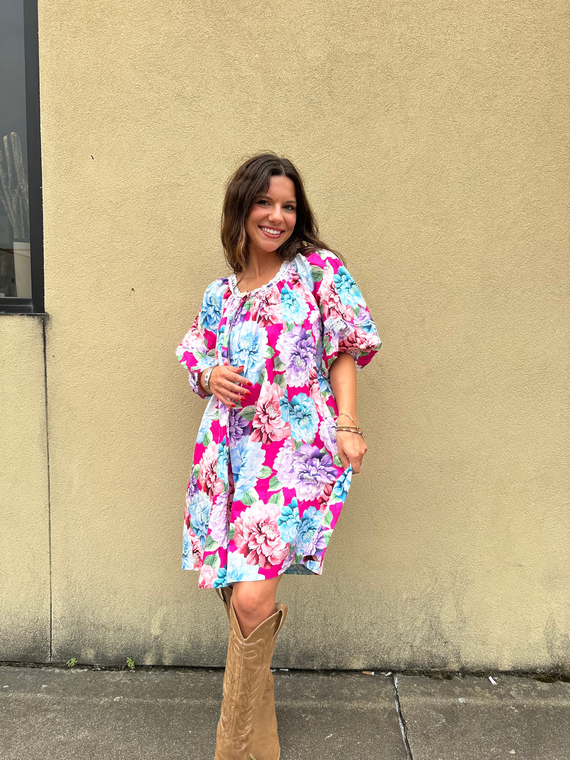Wow the night away in this flirty, floral mini dress in eye-catching fuchsia. Featuring a playful a-line silhouette and trendy puff sleeves, this dress is the perfect balance of girly and alluring. Get ready for some fun in this dress!