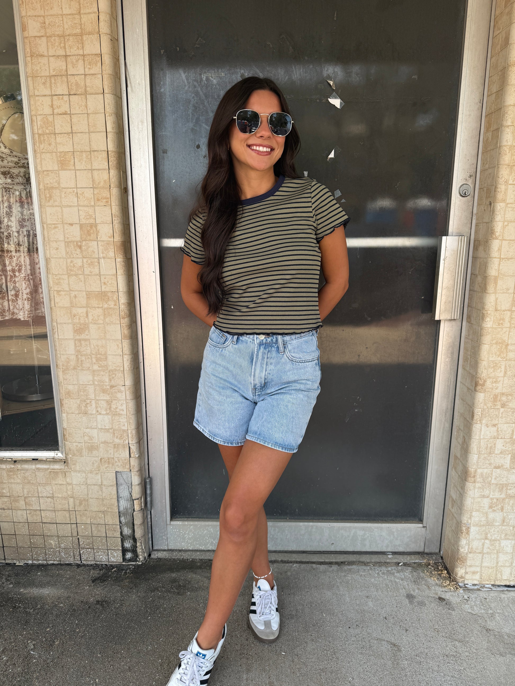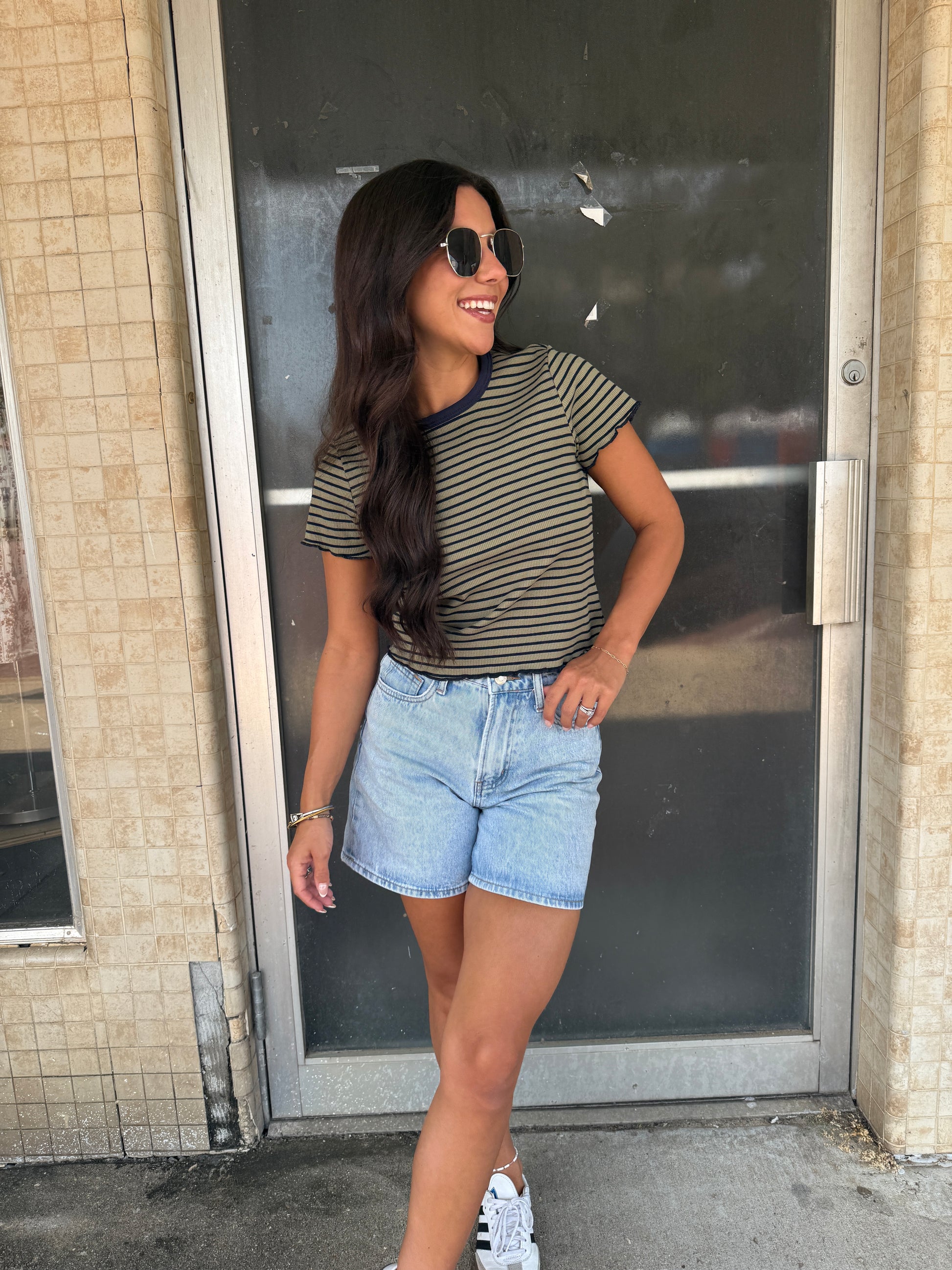 Add a splash of retro charm to your wardrobe with this playful olive and navy striped short sleeve top. Featuring a comfy round neck and a fun lettuce hem, it’s perfect for bringing a fresh, Y2K-inspired vibe to any casual outfit.