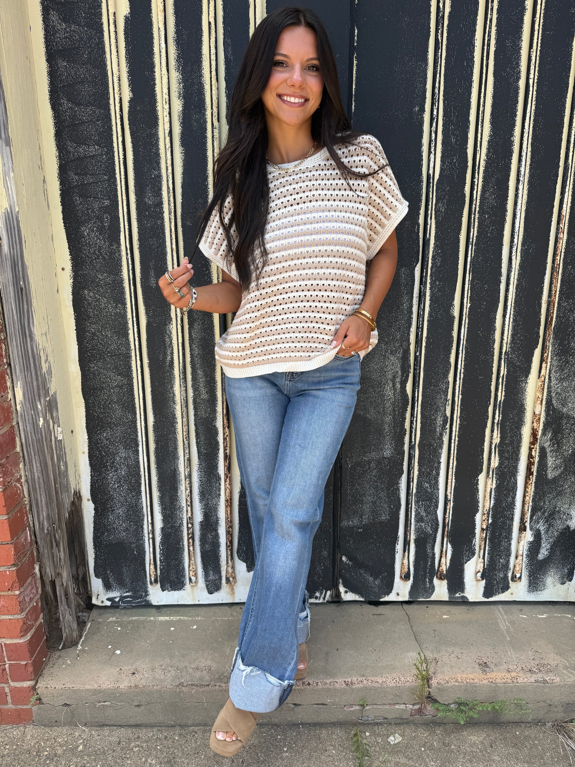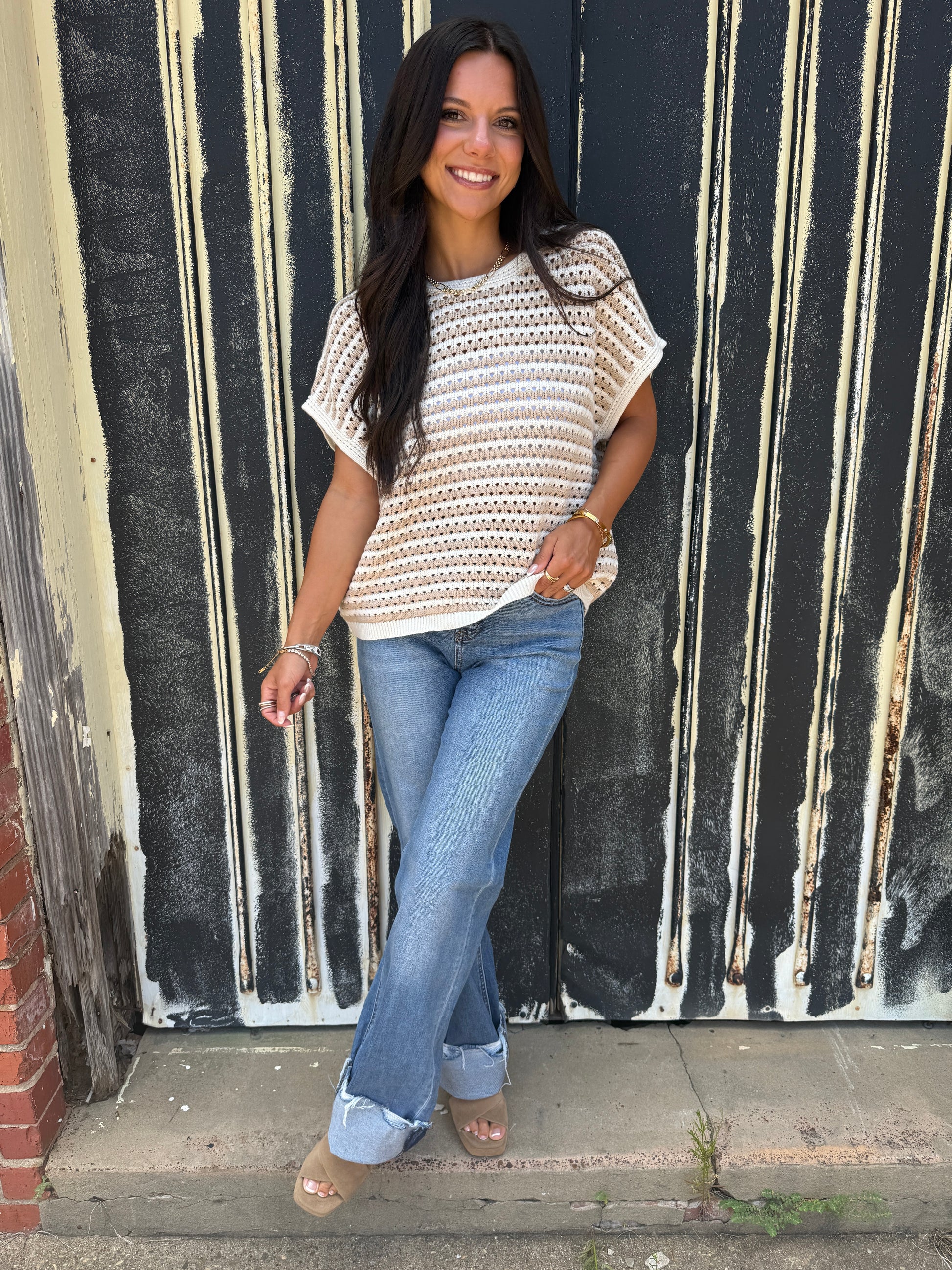 Embrace your unique style with this playful taupe multi-pattern color block short sleeve sweater top. Its fun mix of patterns adds a lively twist to your outfit, while the soft fabric keeps you comfy all day. Perfect for those who love to stand out and go their own way!