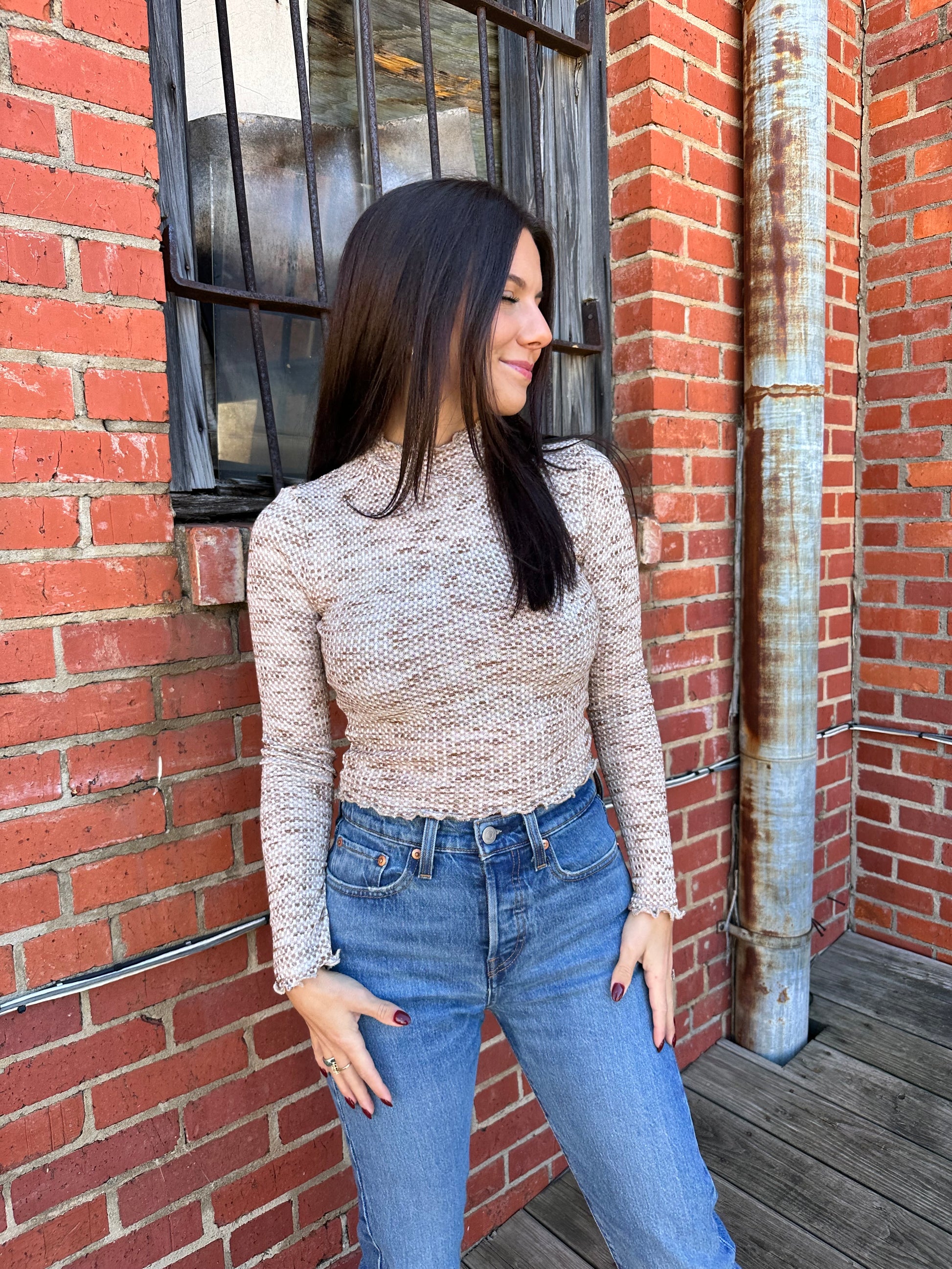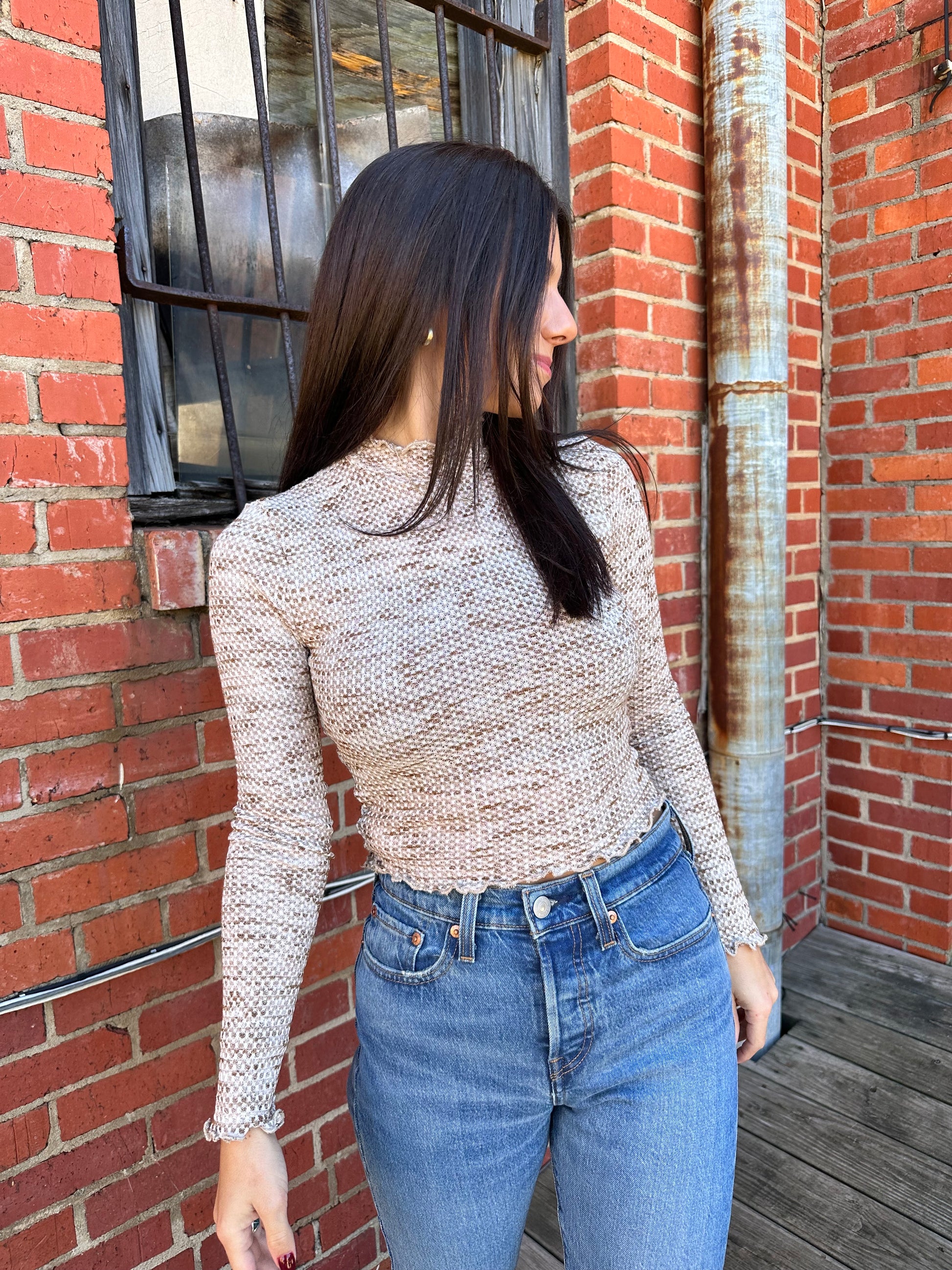 Sport this edgy mocha print long sleeve top and keep your head up high. High mock neck collar and breathable fabric keeps you comfortable all day long. Show off your style with this unique statement piece!
