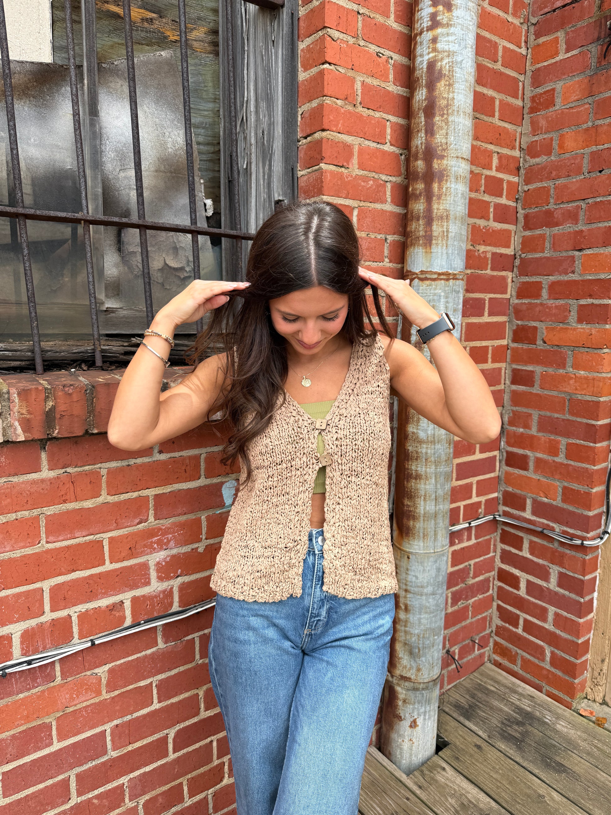 Stay stylishly cozy with the In the Moment vest! This playful square button sand vest features a front split neck and a cardigan-style design, perfect for layering and adding a fun twist to your outfit. Easy to wear and effortlessly chic, it’s your new go-to for casual cool.