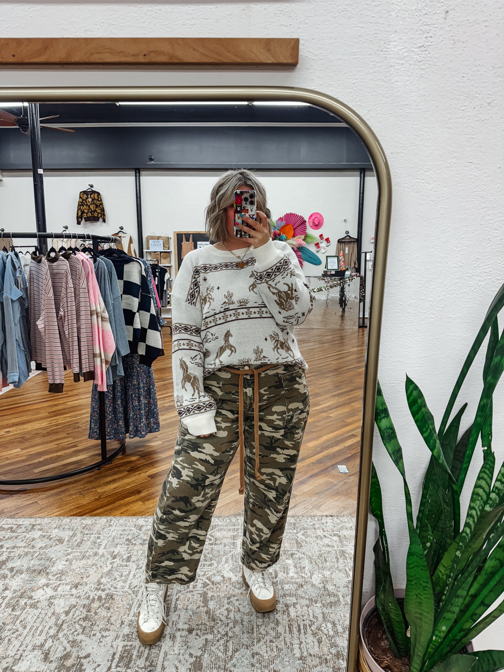 Saddle up for cozy vibes in this oversized western print sweater. Whether you're channeling ranch-ready energy or just want to feel like the coolest cowpoke in town, this piece delivers laid-back style with serious comfort. Available in creamy or moody mauve, it's the perfect throw-on for casual days when you want to make a statement without trying too hard. Roomy fit means you can layer it, lounge in it, or wear it solo—your call, partner.