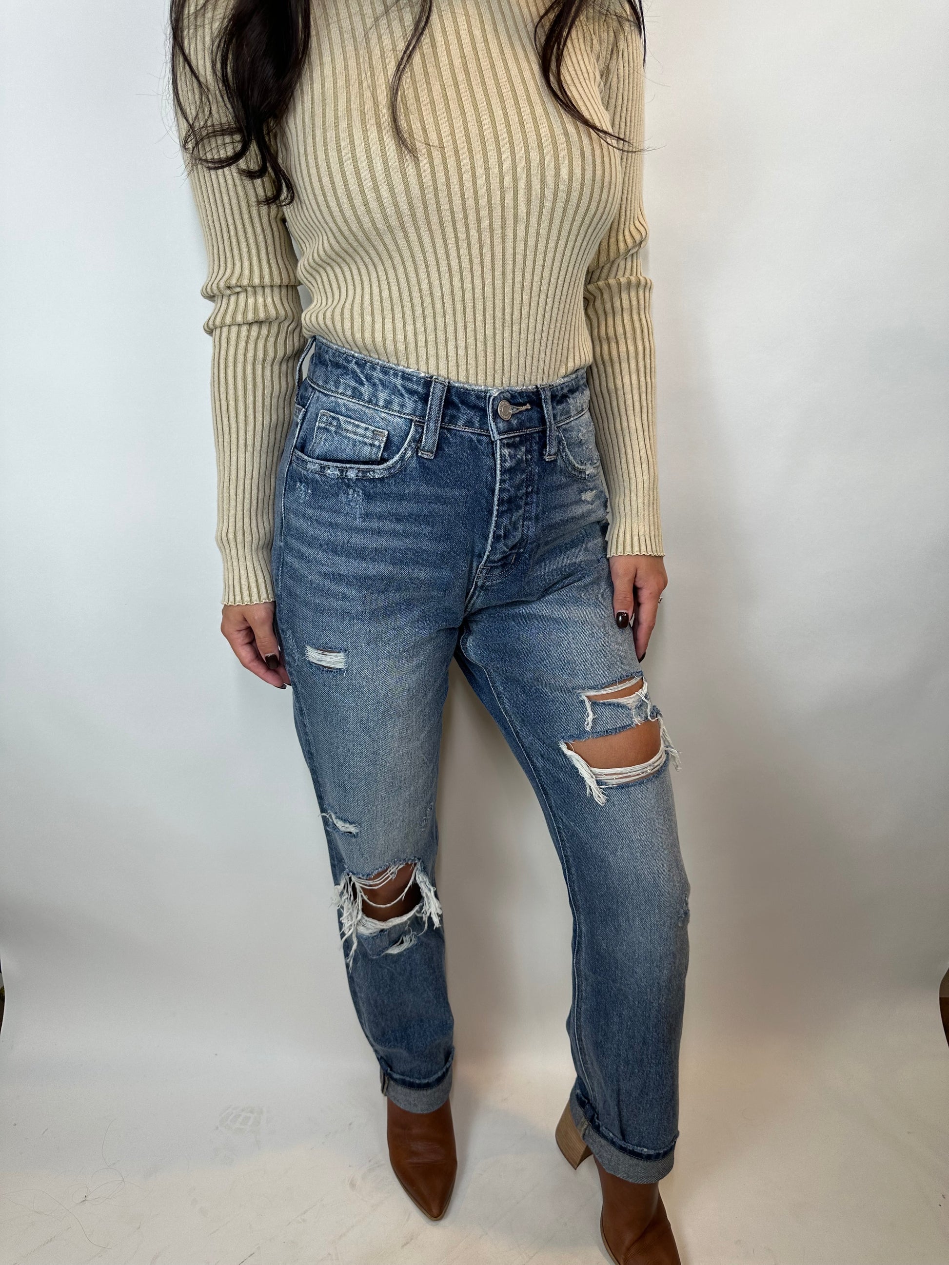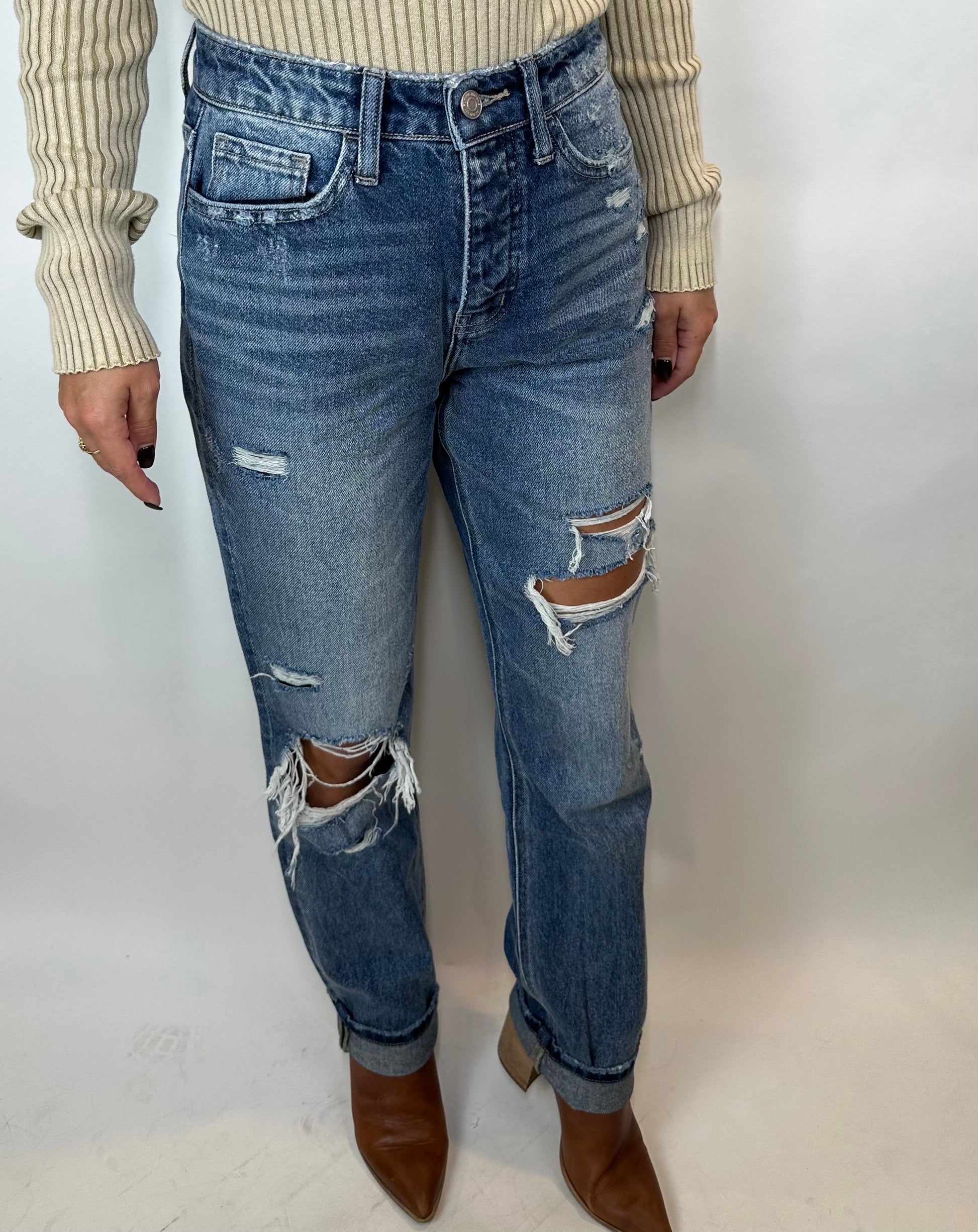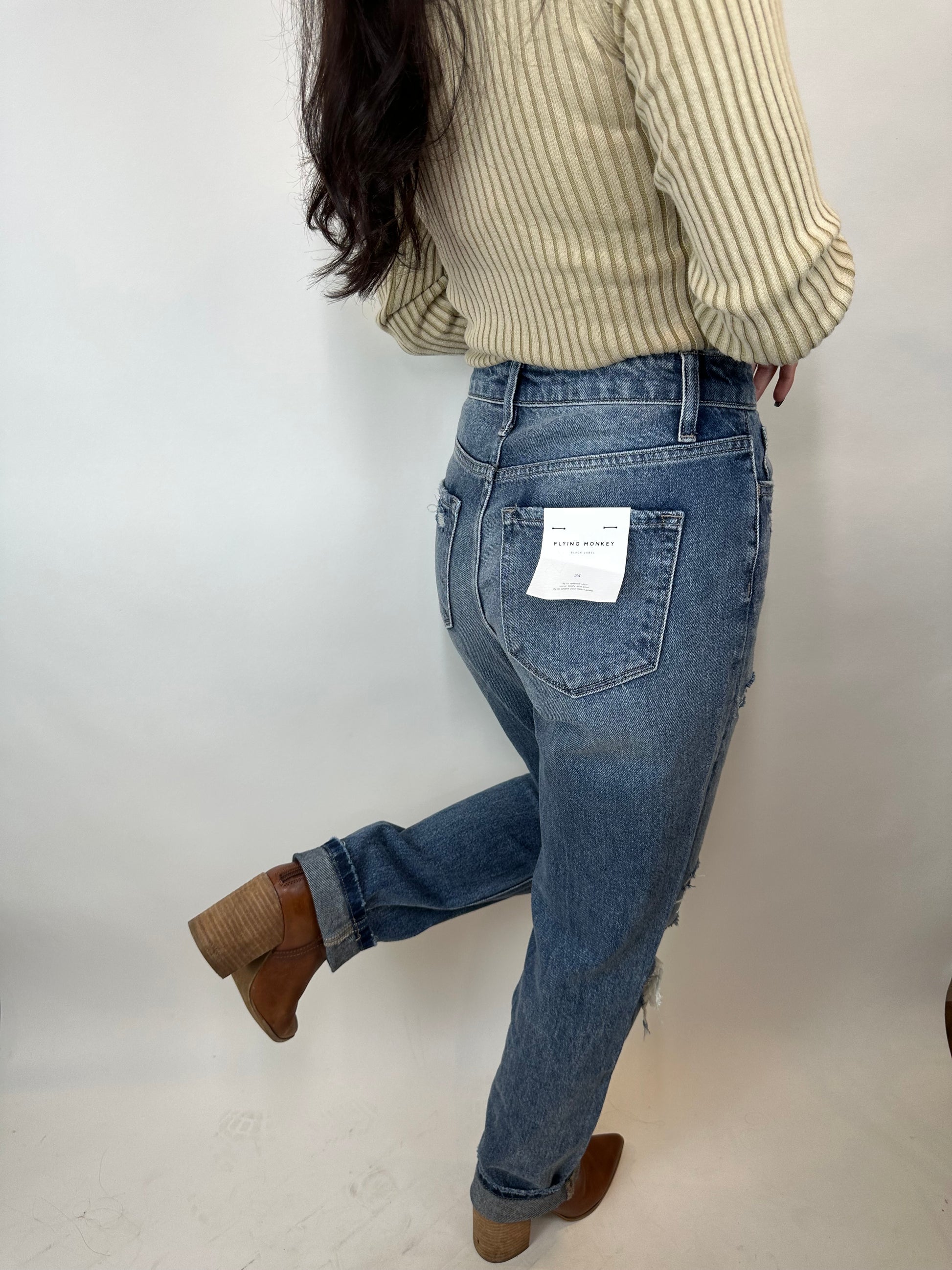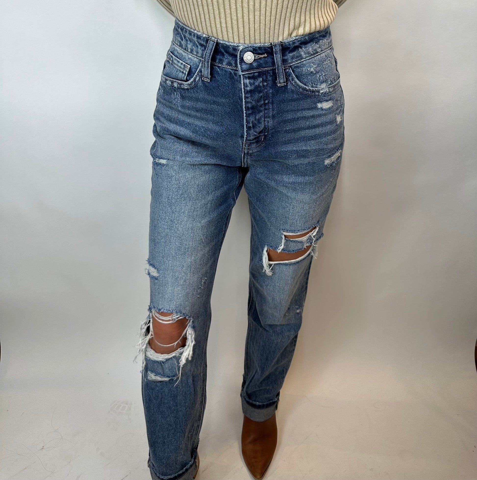 Introducing Last night Mom Jeans - these stylishly distressed stretch jeans are the perfect way to show off your street-wise style! Feel the freedom of the extra-stretchy fit and strut your way through the day with confidence and flair. Unleash your inner cool-mom!