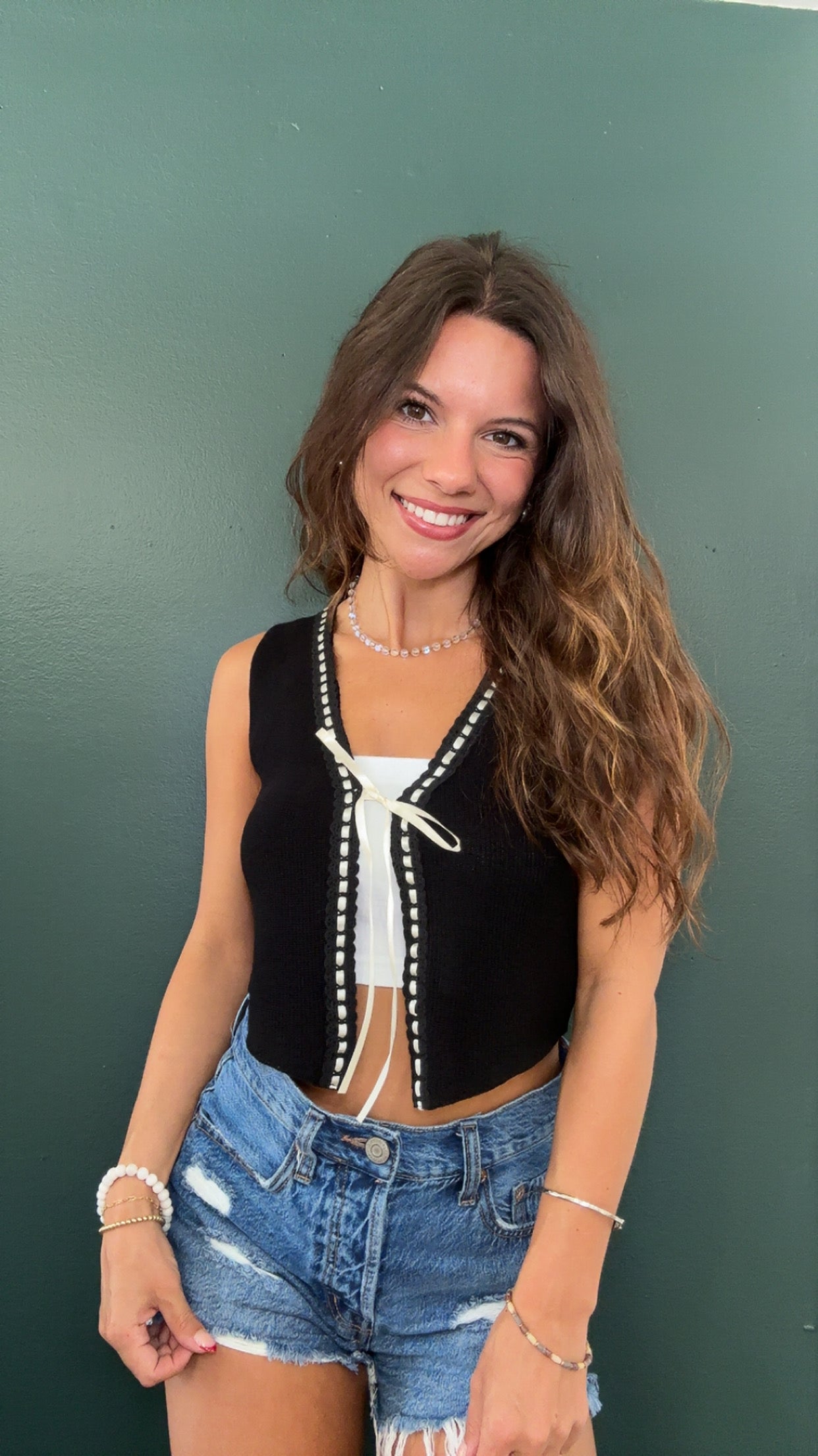 Add a flirty twist to your look with this playful black knit vest featuring a charming front tie and delicate lace trim. The ribbon detail adds a touch of sweetness, making it perfect for layering or wearing solo when you want to keep things fun and flirty.