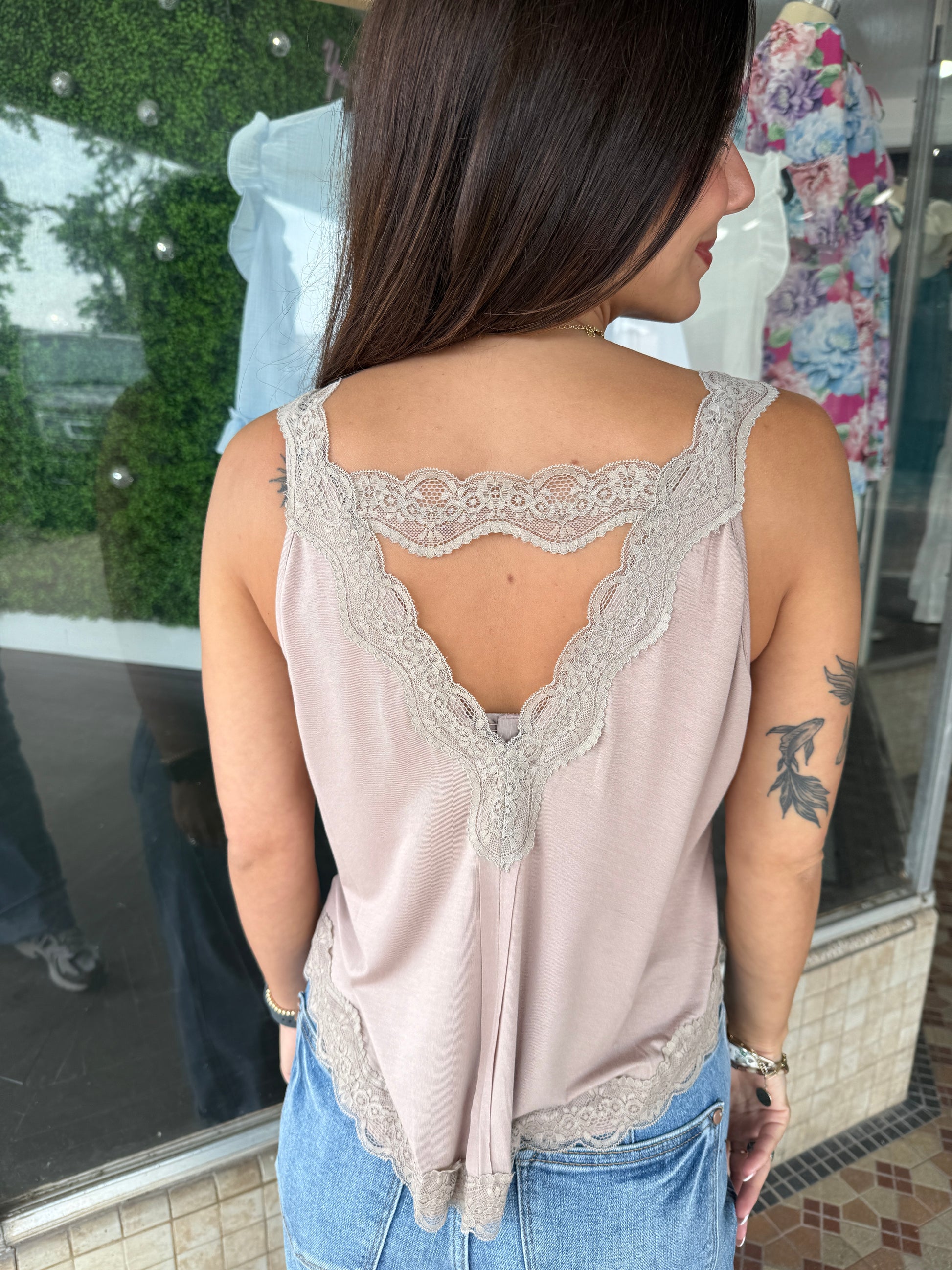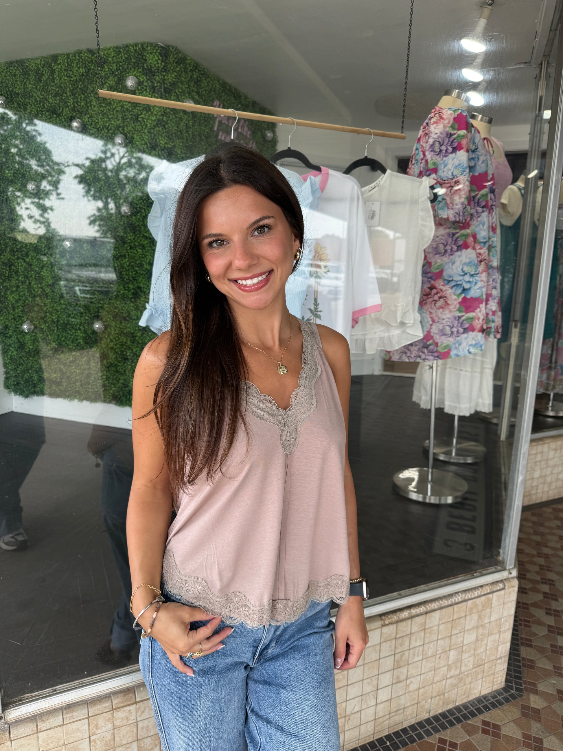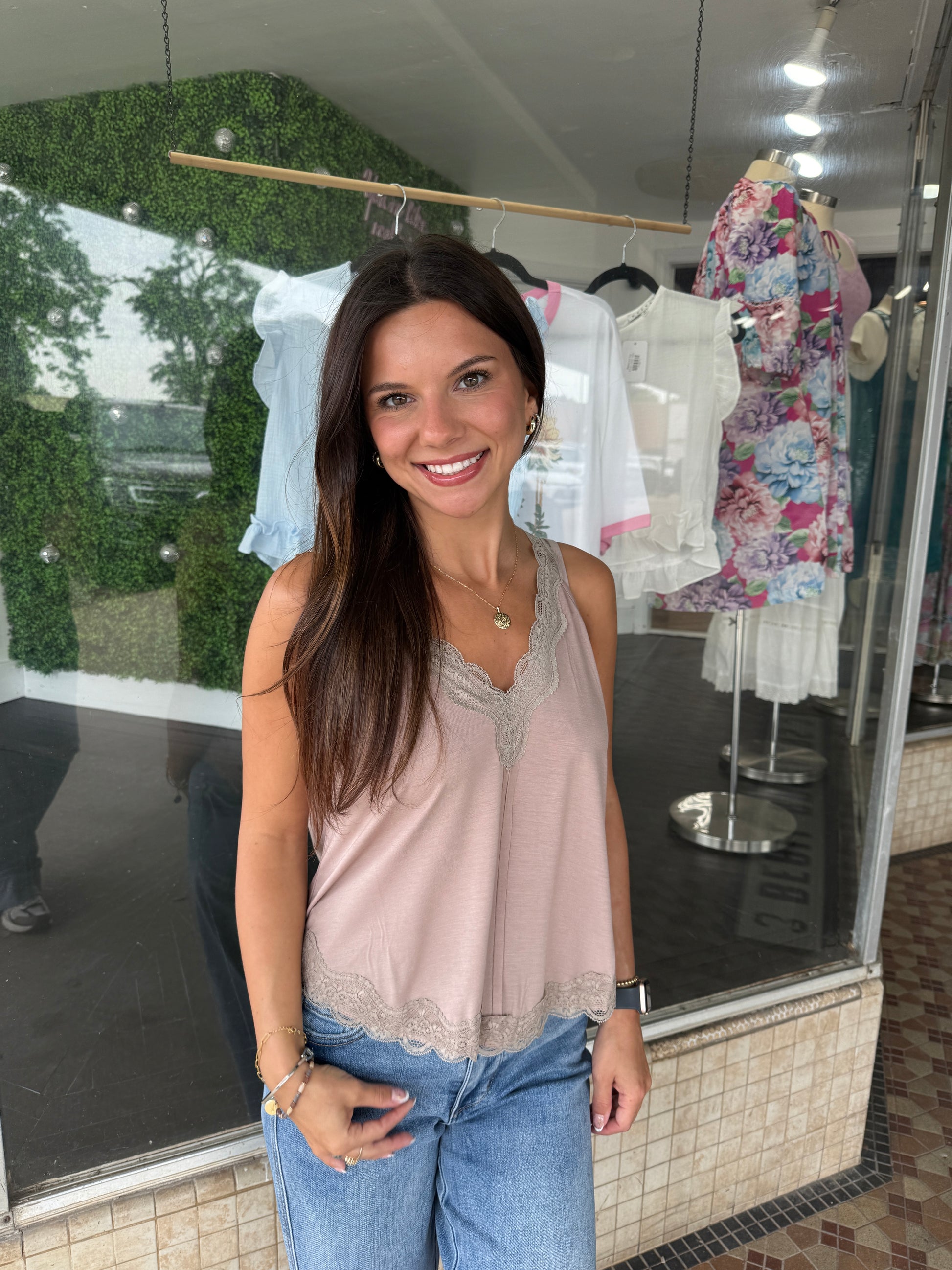 Catch every eye in our "Look My Way Top" - a mocha sleeveless v-neck beauty with delicate lace trim detailing. This flirty tank adds just the right touch of feminine charm to your casual wardrobe. Perfect for turning heads whether paired with your favorite jeans or dressed up for a night out!