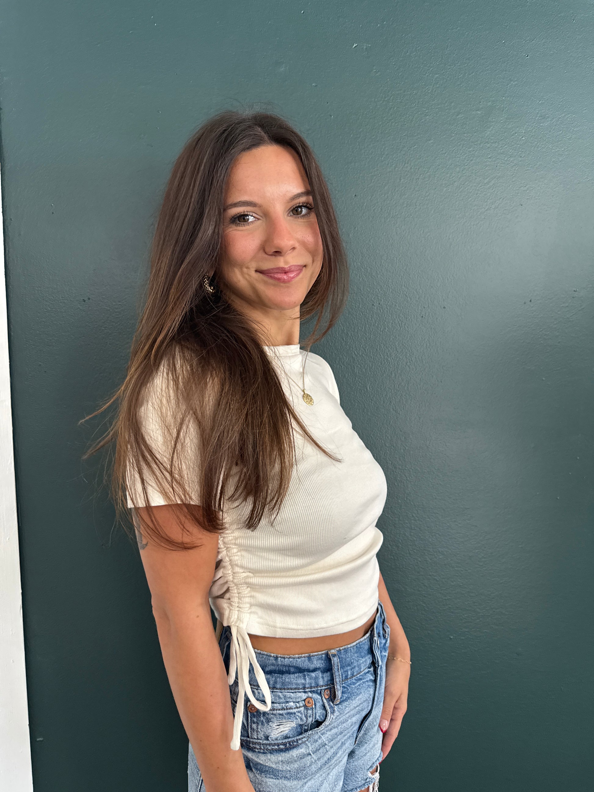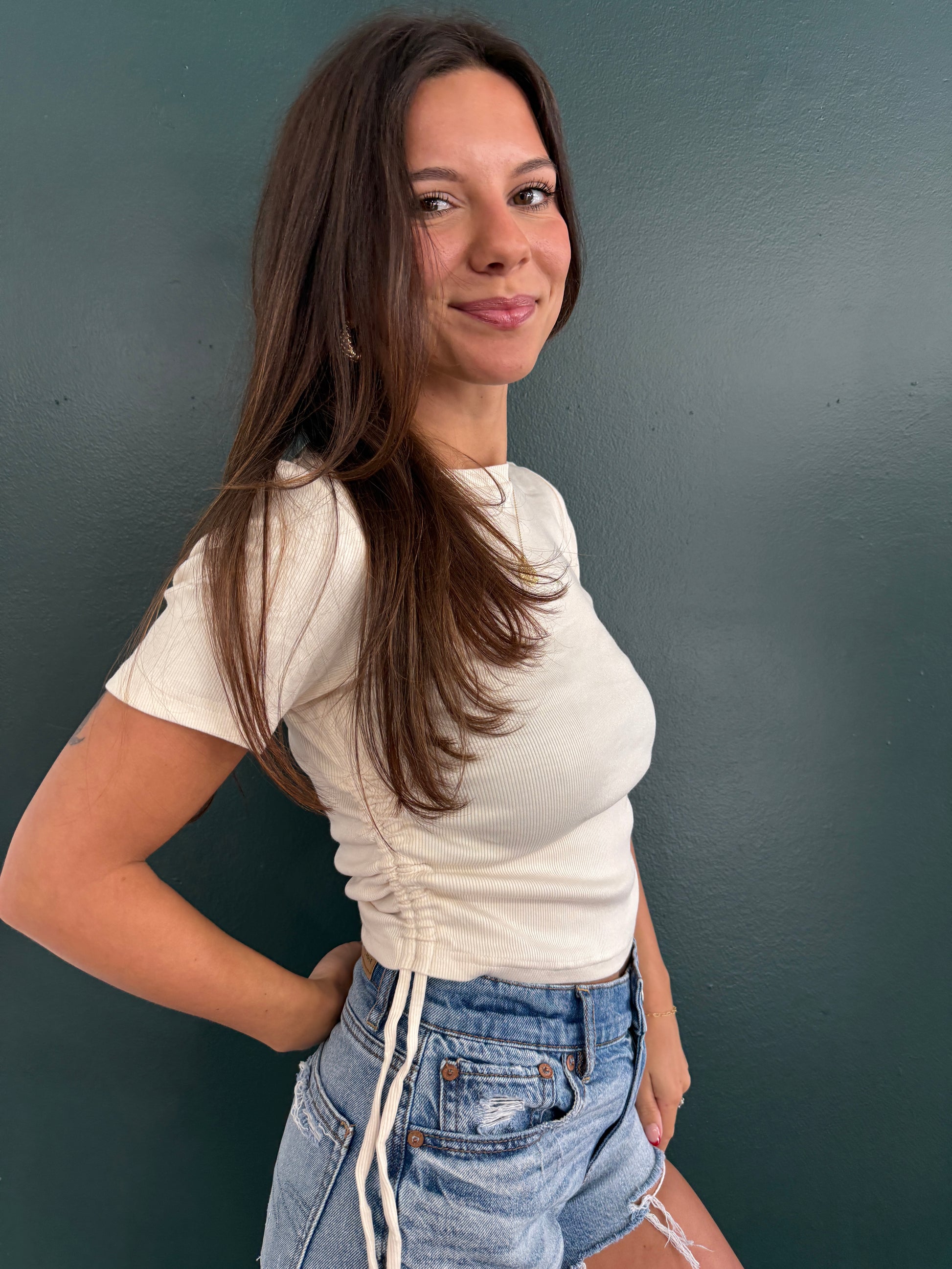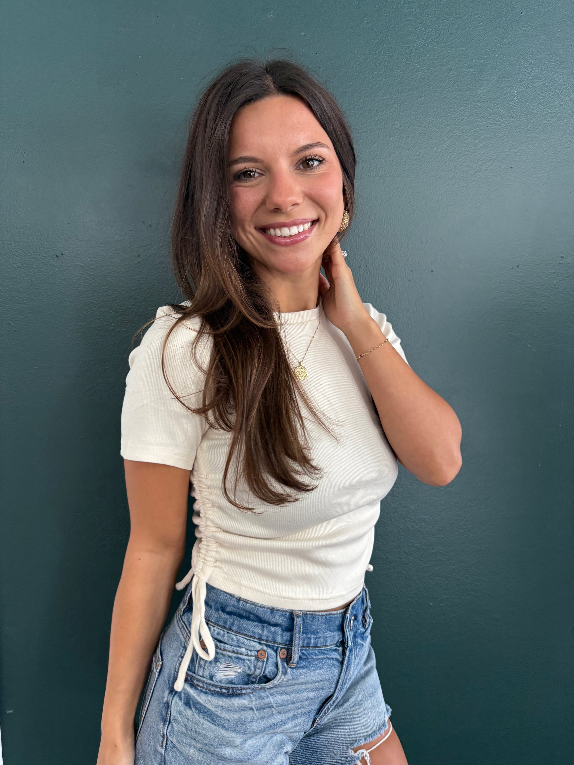 This cream cotton Love Lies Top features a charming side cinch detail that lets you customize your fit with a playful twist. Soft and breathable, it’s perfect for adding a touch of effortless style to your everyday look.