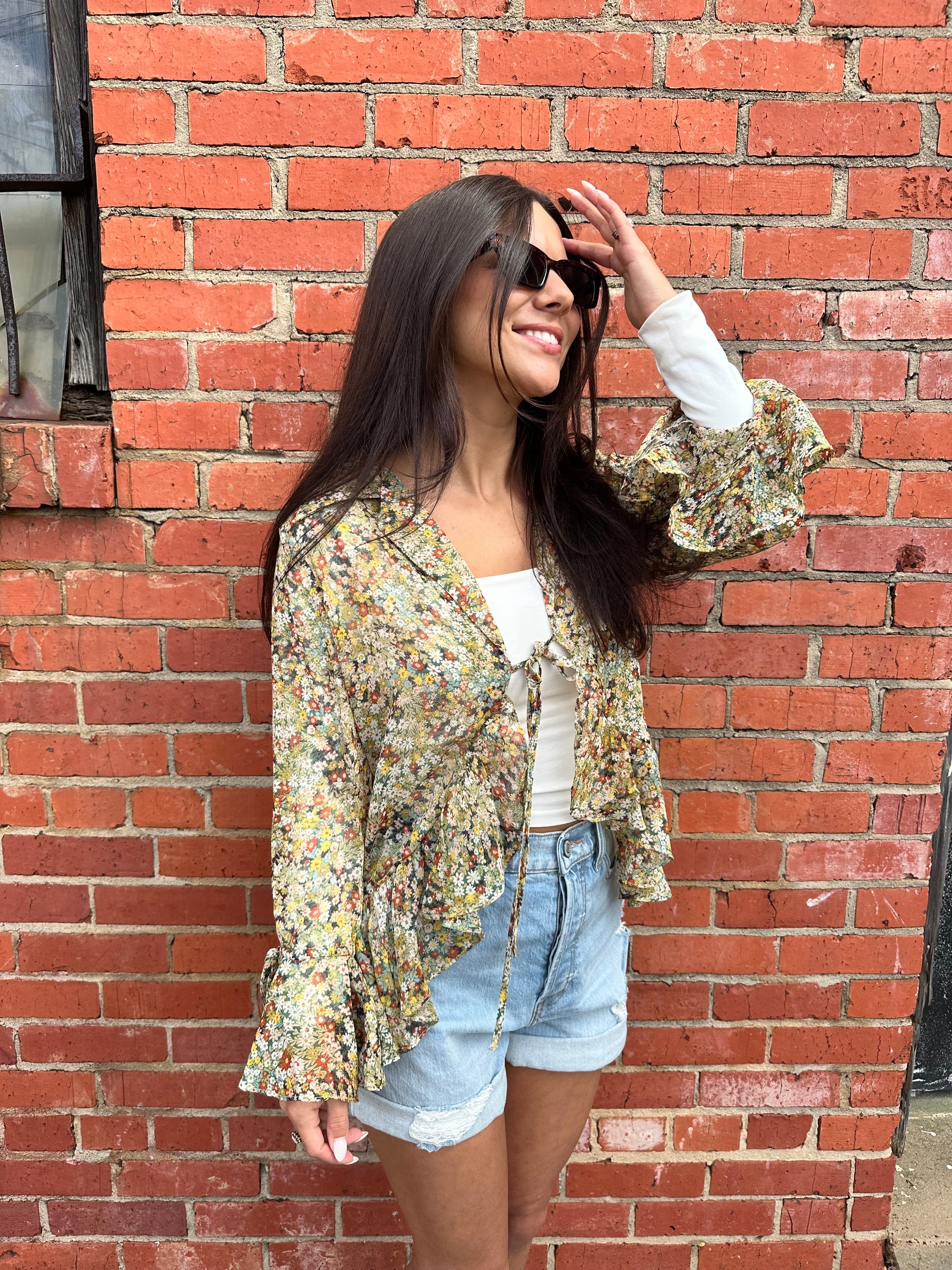 Get ready to turn heads and make a statement with our Major Babe Top! Featuring a vintage floral print and playful ruffled sleeves with a front tie, this top is the perfect combination of feminine and fun. Amp up your wardrobe with this must-have piece!