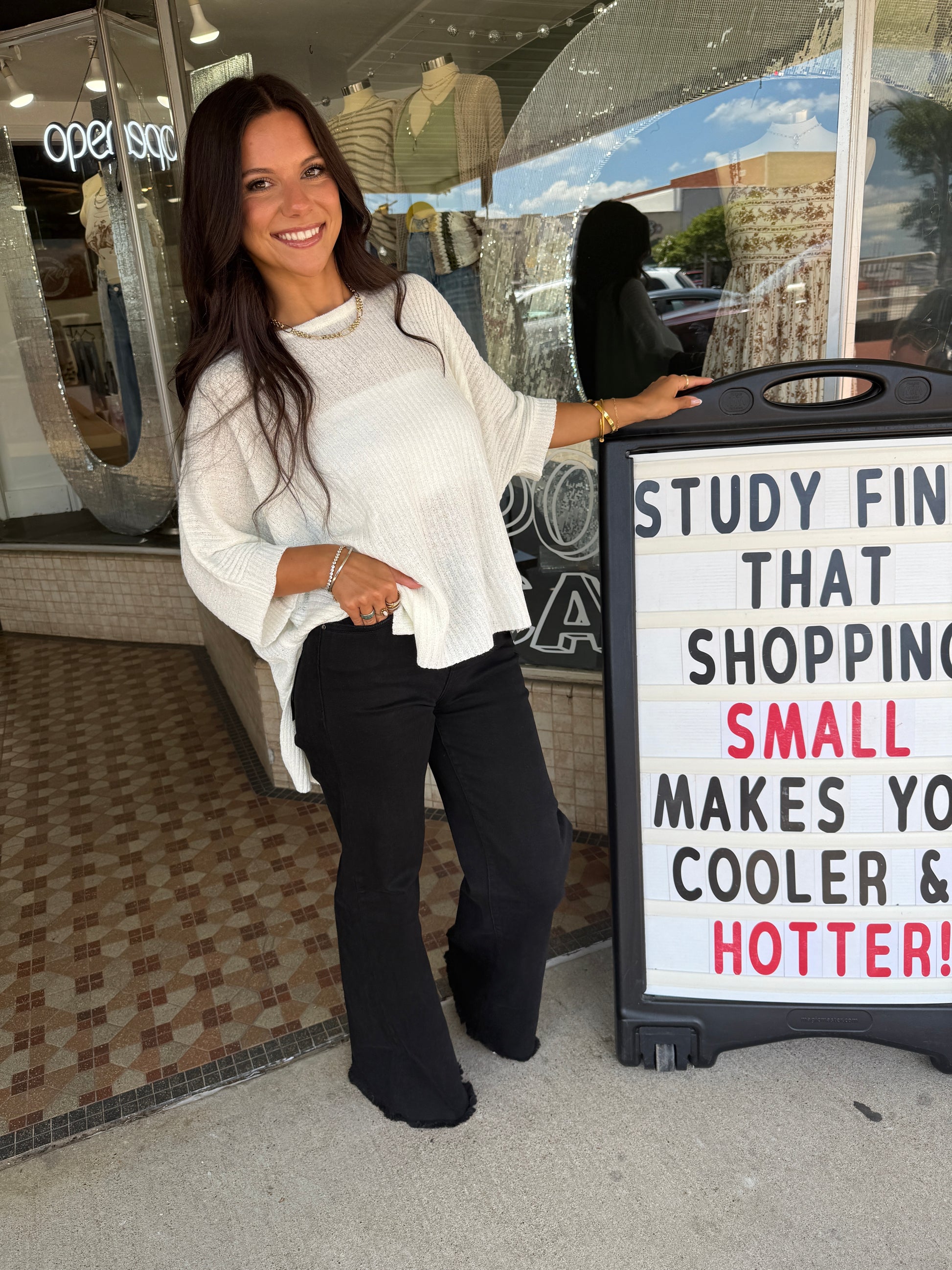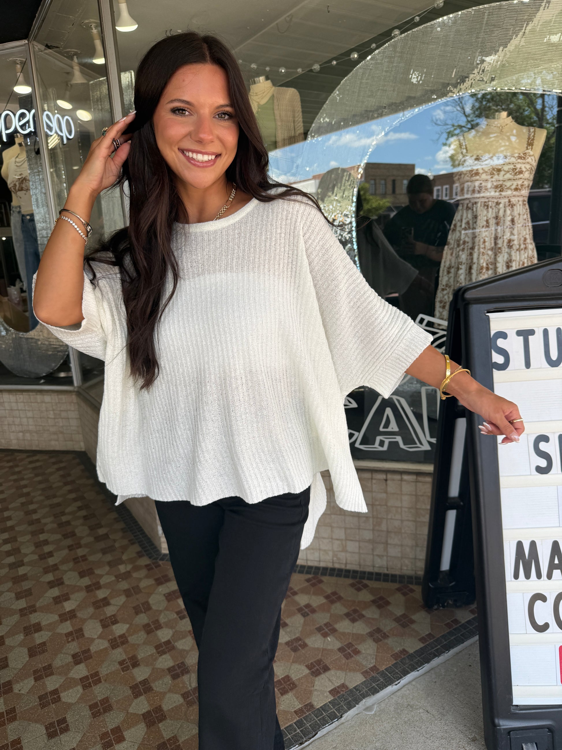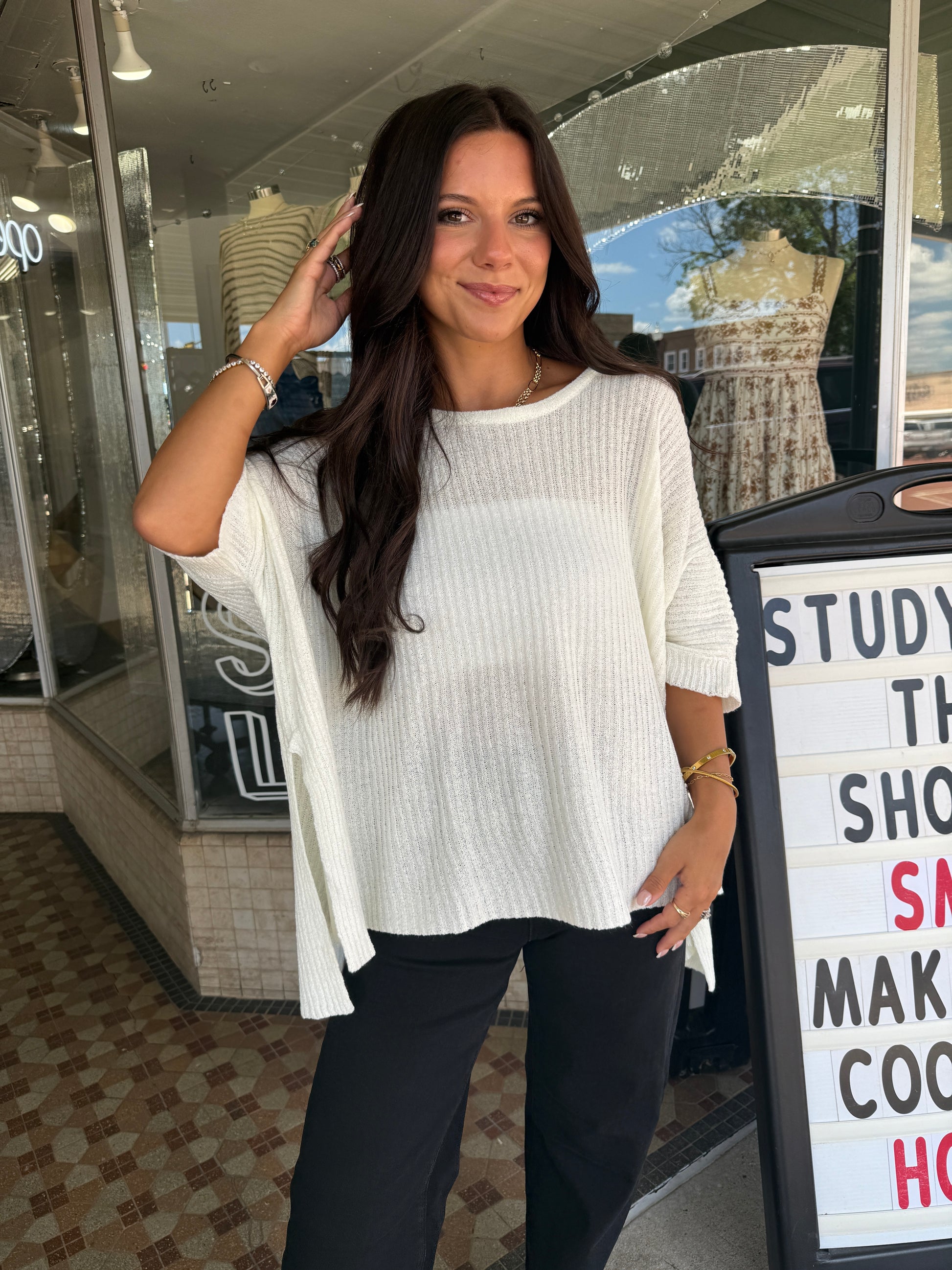 Embrace cozy vibes with the New Days Top, an ivory oversized sweater featuring a round neck and dolman short sleeves. Its relaxed fit makes it perfect for layering or lounging, adding effortless style and comfort to your day. Playfully oversized, it’s your new go-to for easy, breezy looks.