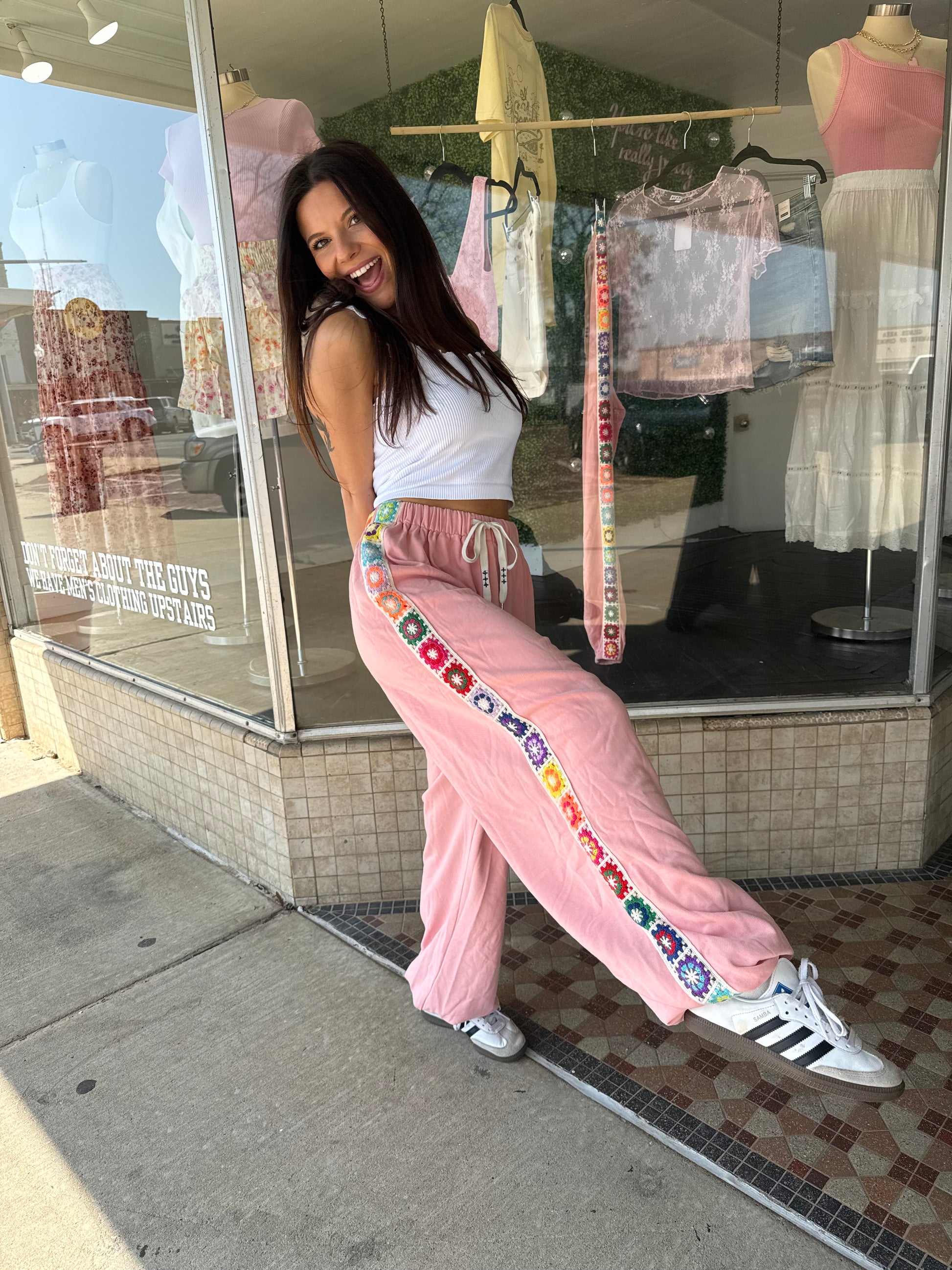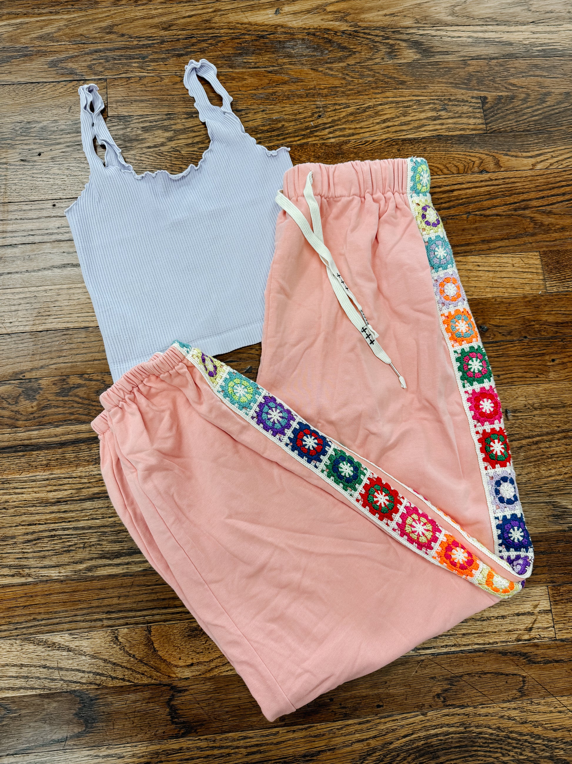 Get cozy in style with our Peach Crochet Joggers. These baggy fit joggers are perfect for lounging or running errands. The square patch trim adds a unique touch, while the elastic French terry material ensures comfort. A must-have addition to your wardrobe!