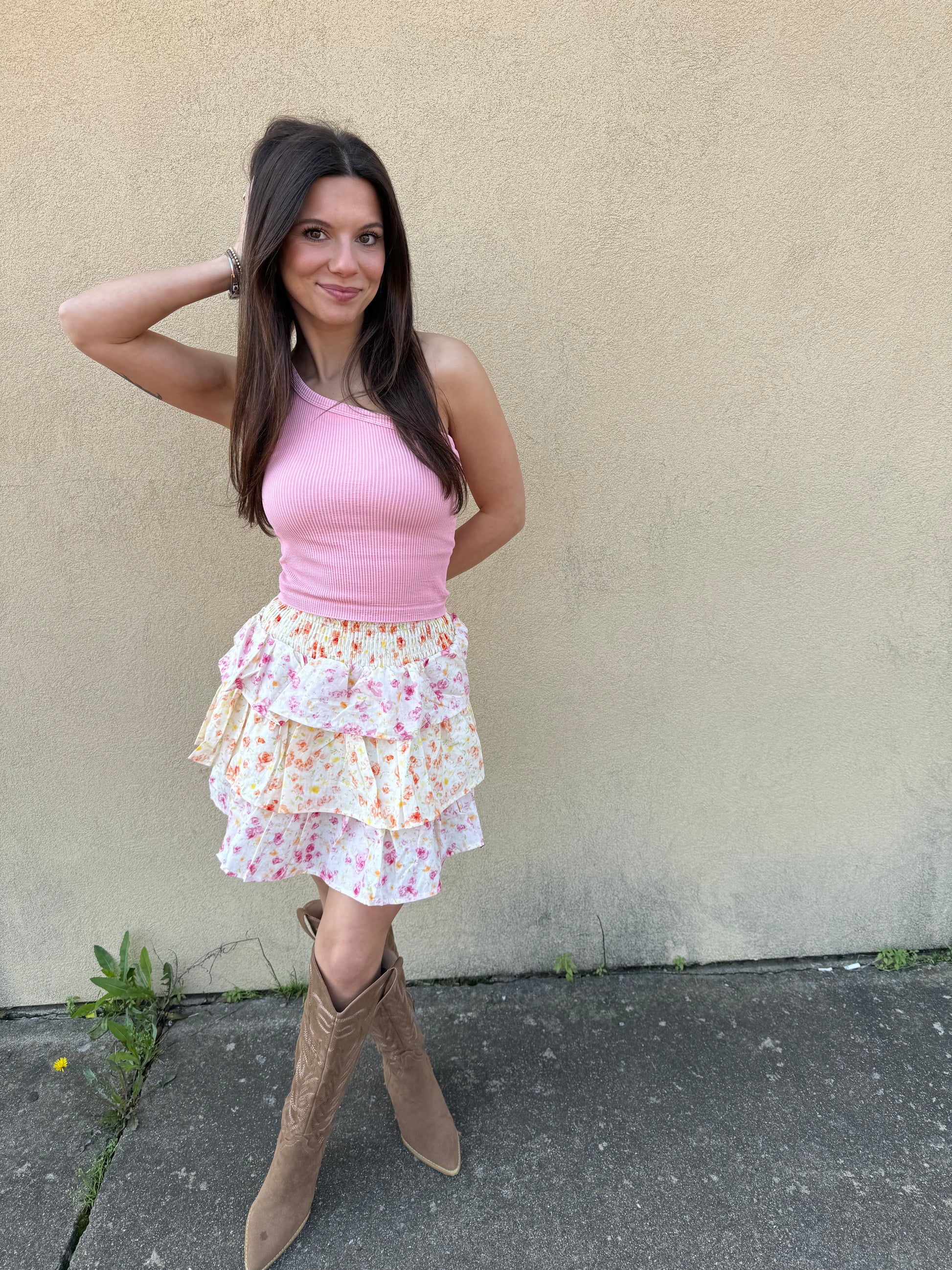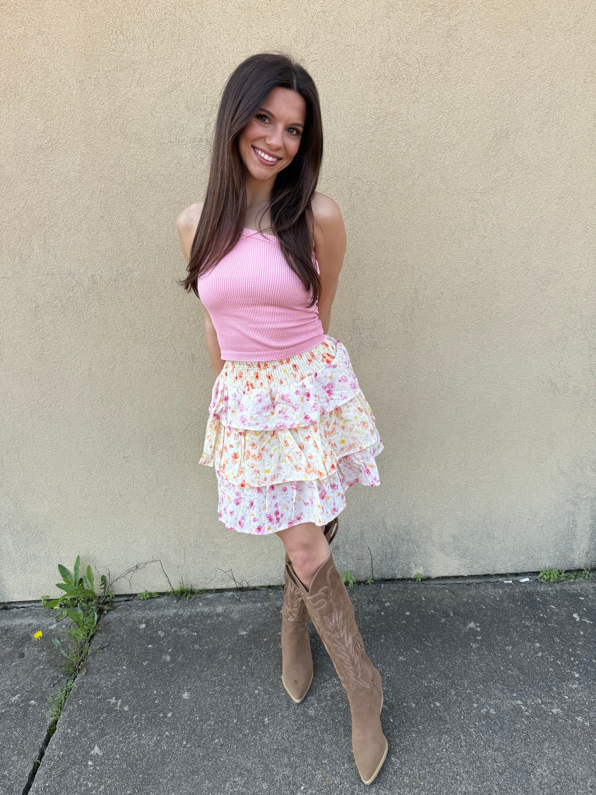 Bring a touch of whimsy to your wardrobe with our Ruffled in Florals Skirt! This playful mini features a mix of pink and yellow multi-layered ruffles in a fun and flirty tiered design. The colorful floral print adds a cheerful touch to any outfit. (Be prepared to turn heads!)