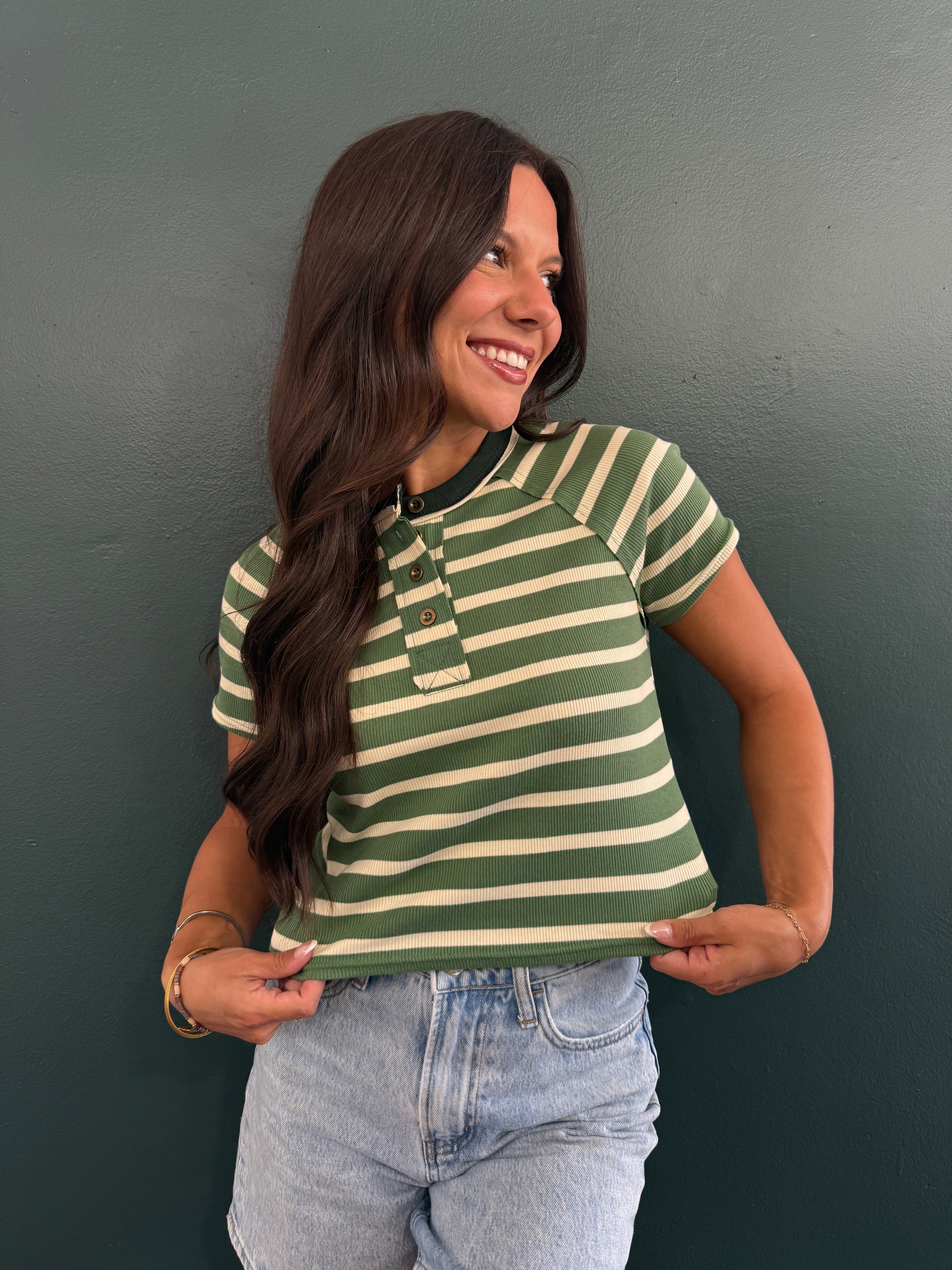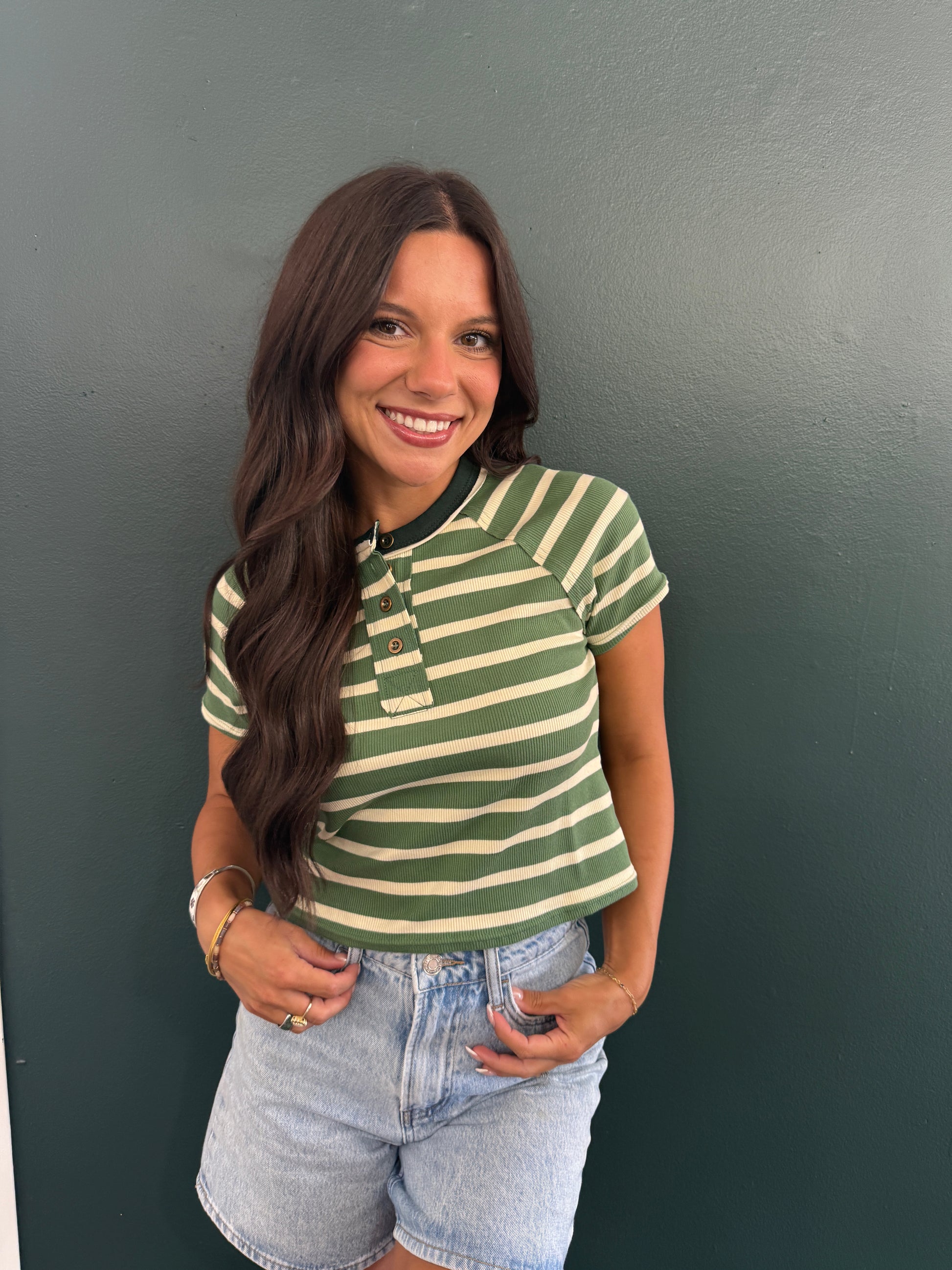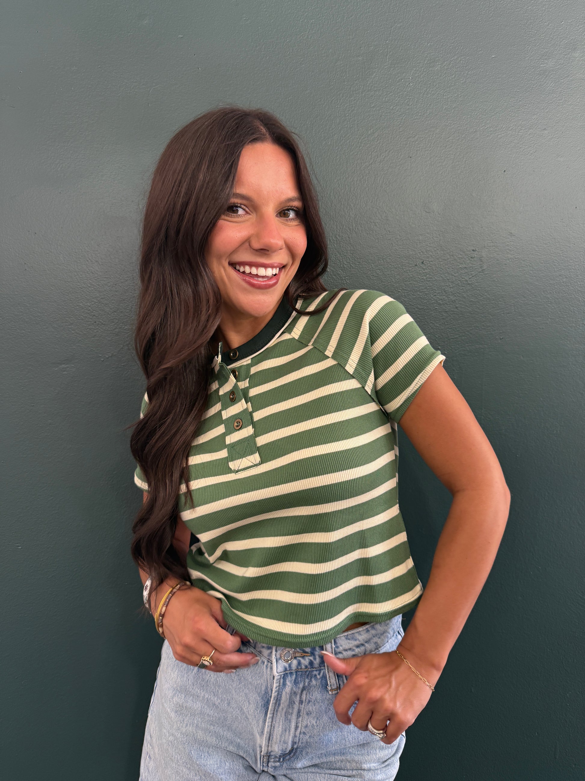 This playful short sleeve top features cream and green stripes with a contrasting neckband, capturing a fun, retro school girl vibe. Its light, breathable fabric makes it perfect for casual days filled with energy and style. Add a touch of youthful charm to your wardrobe with this charming, easy-to-wear piece.