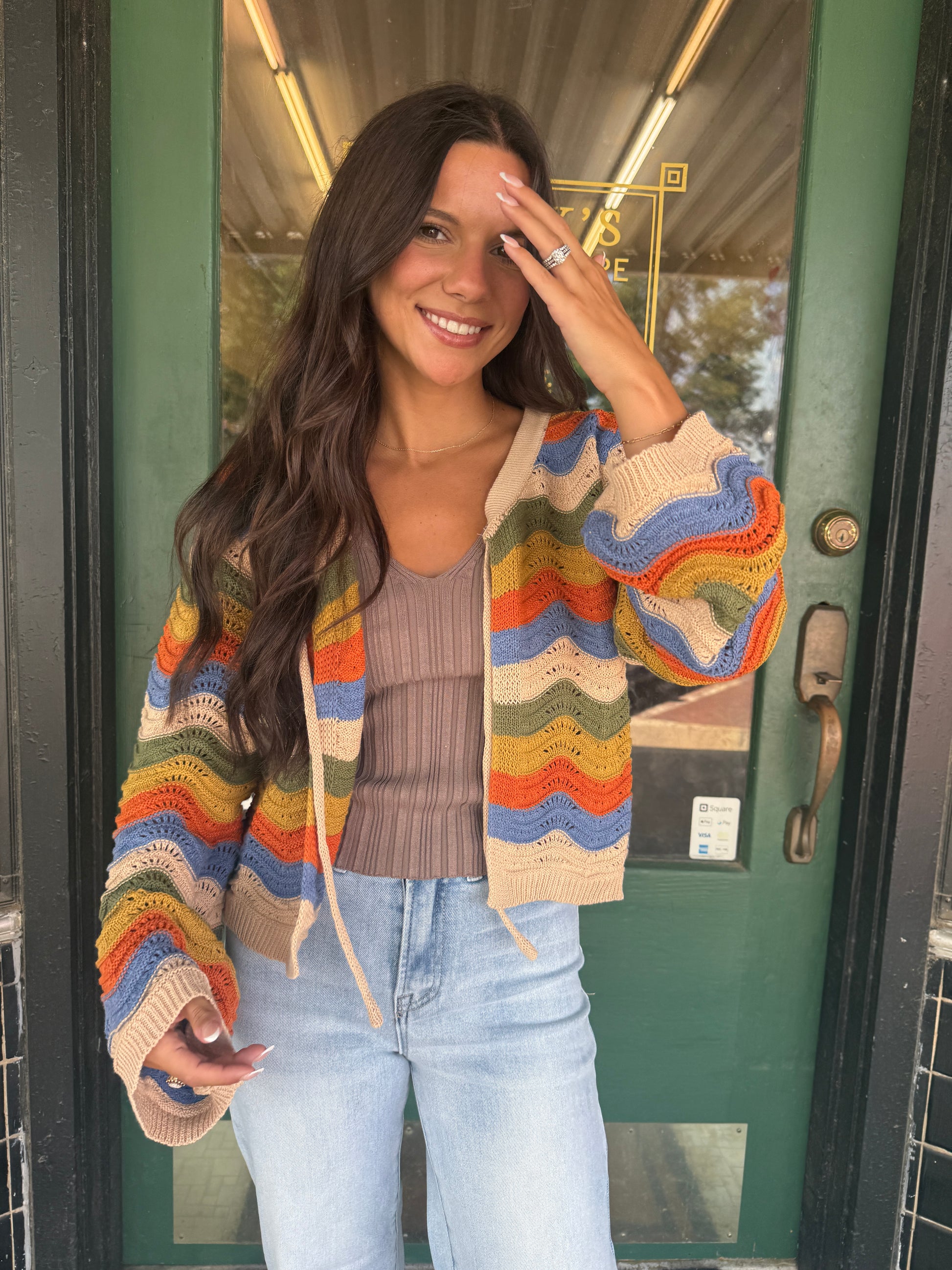 Add a splash of fun to your wardrobe with this taupe multi-color wavey front tie cardigan. Its playful waves and vibrant hues bring a lively twist to cozy comfort, while the front tie adds a flirty, adjustable fit. Perfect for layering and brightening up any outfit with a cheerful vibe.