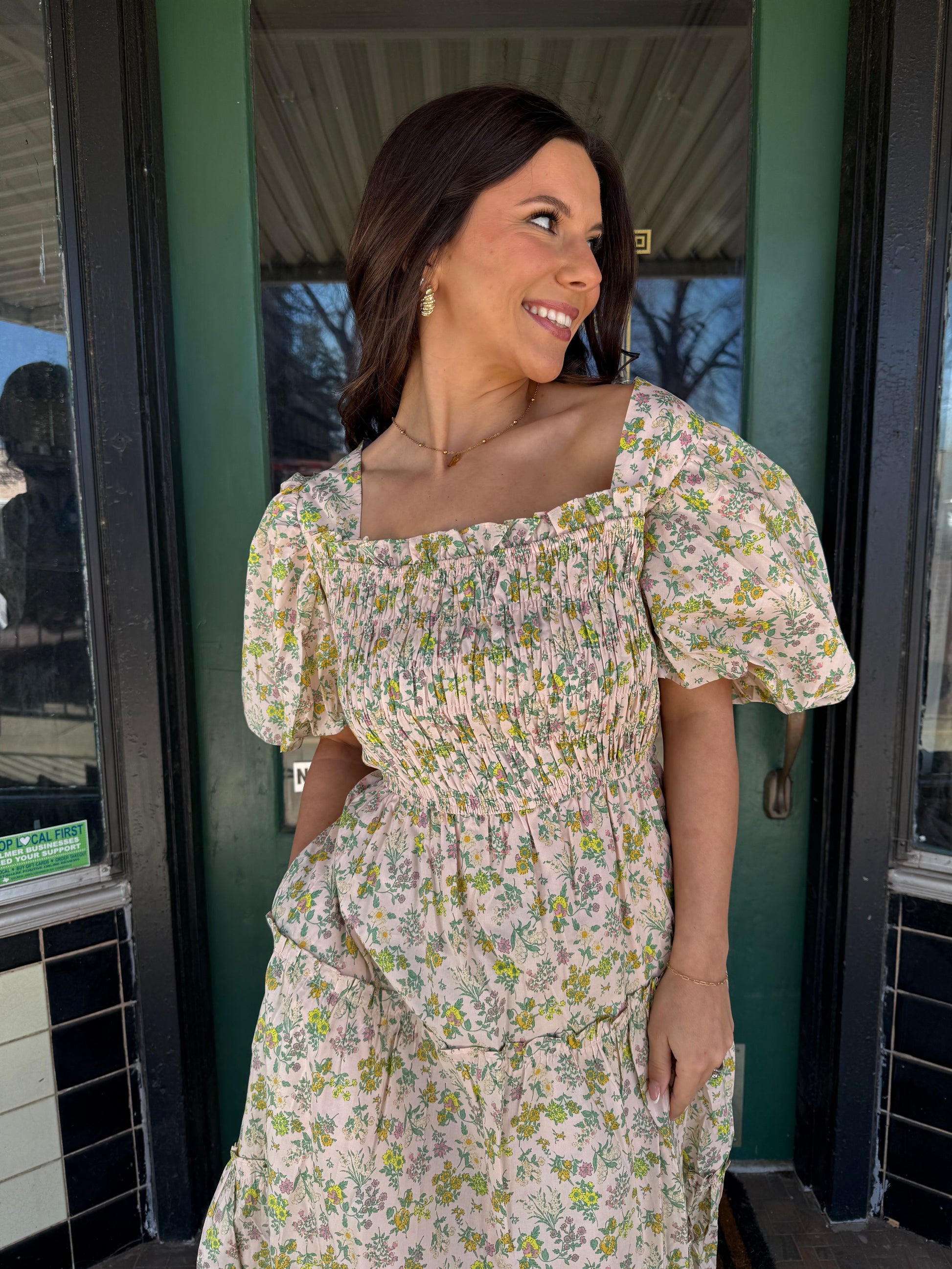 Get ready to fling into spring with this playful Peach colored floral dress! Featuring a fun multi-floral print, puff sleeves, and a smocked tiered ruffle design, this midi dress is perfect for any spring occasion. Say hello to your new go-to for a flirty, feminine look!