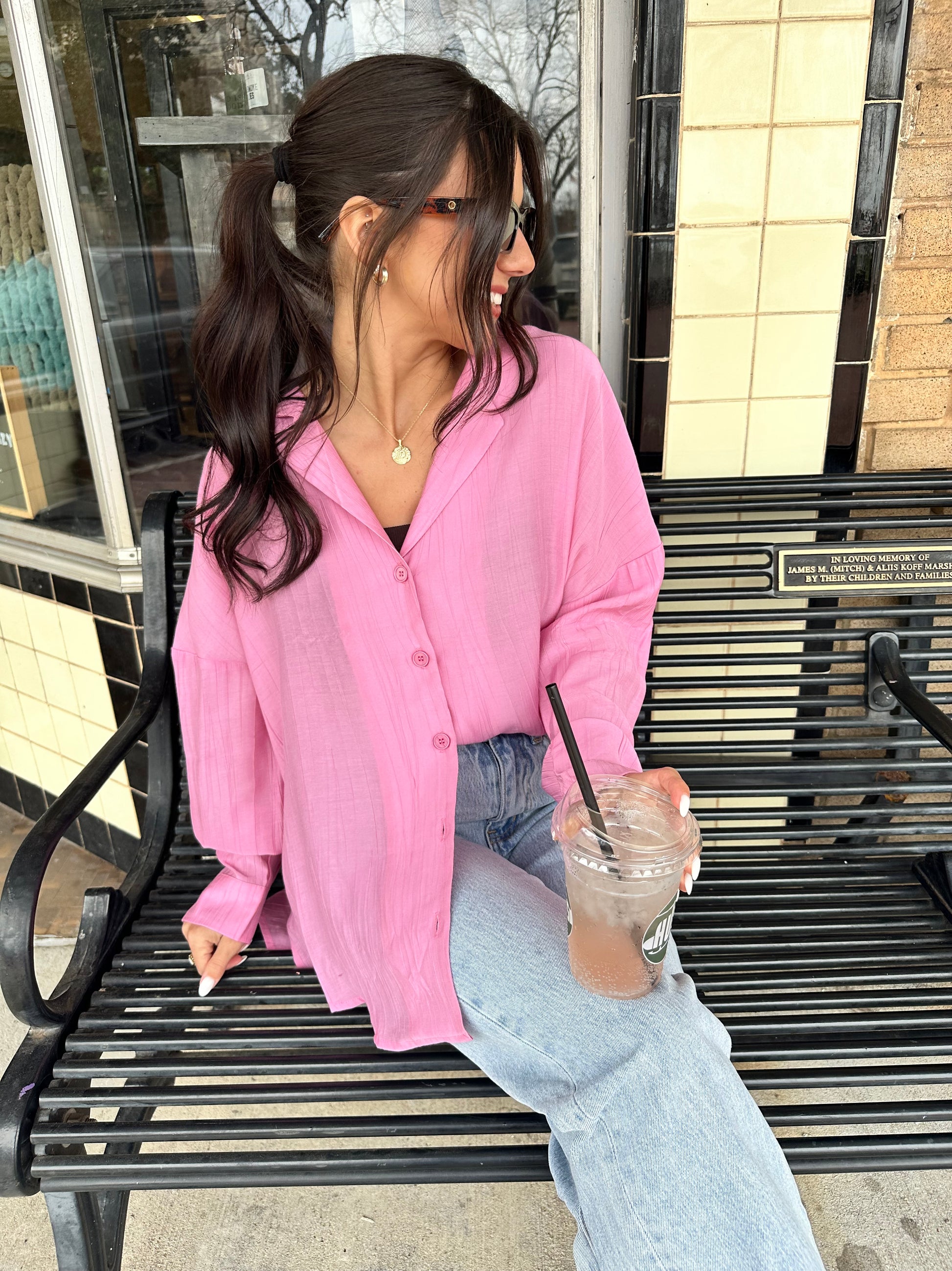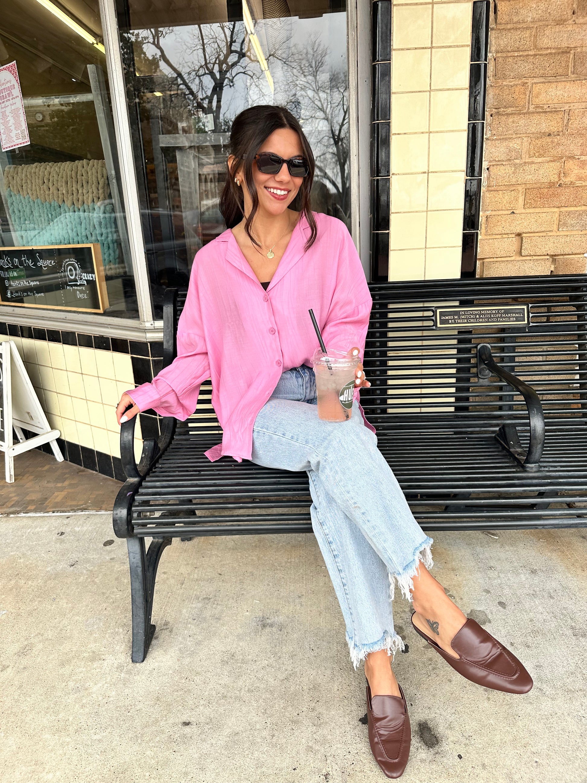 Get ready for weekend adventures in this easy pink top! Light and breezy, with a semi-sheer texture and flattering v neck, it's perfect for any casual occasion. Plus, the playful buttons add a cute touch.