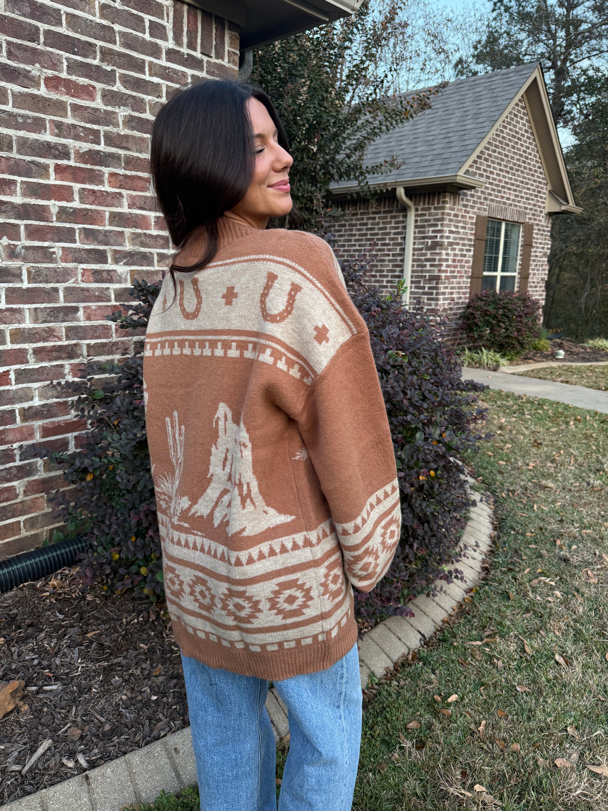 Saddle up in style with this oversized western graphic cardigan that's got serious cowboy charm. Featuring a bold natural-toned design with authentic western horse imagery, it's the perfect throw-on piece for anyone who loves that laid-back ranch aesthetic. The relaxed fit drapes beautifully over your favorite tees or dresses, making it ideal for casual days or cozy nights. Whether you're channeling your inner cowgirl or just vibing with western flair, this cardigan brings personality and comfort in one easy-wearing package.