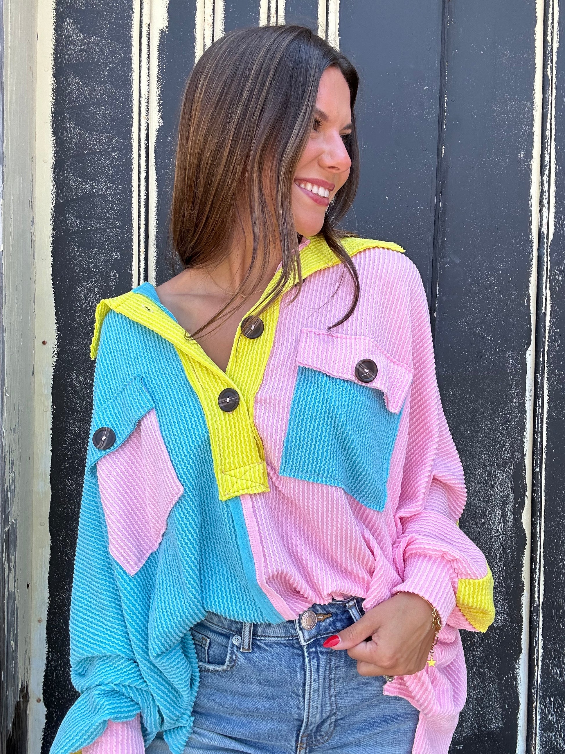 Unleash your wild side with our Wild Cotton Candy Top! This fun and colorful pullover features a pink, blue, and yellow color block design that will surely make you stand out. Made with ribbed material, it's both stylish and comfortable.